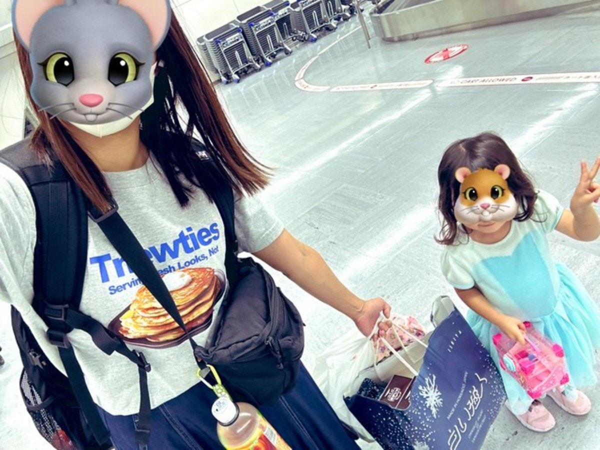 この写真だけでもくるるさんの苦労が伝わってくるようです…。ぱんぱんに詰まったカバンやお土産、さらにはカラビナでぶら下げられた飲料ボトル。移動で疲れ切った体にこれだけの荷物は本当に大変です。さらに娘さんから目が離せないとなると、親の偉大さを感じさせられます。