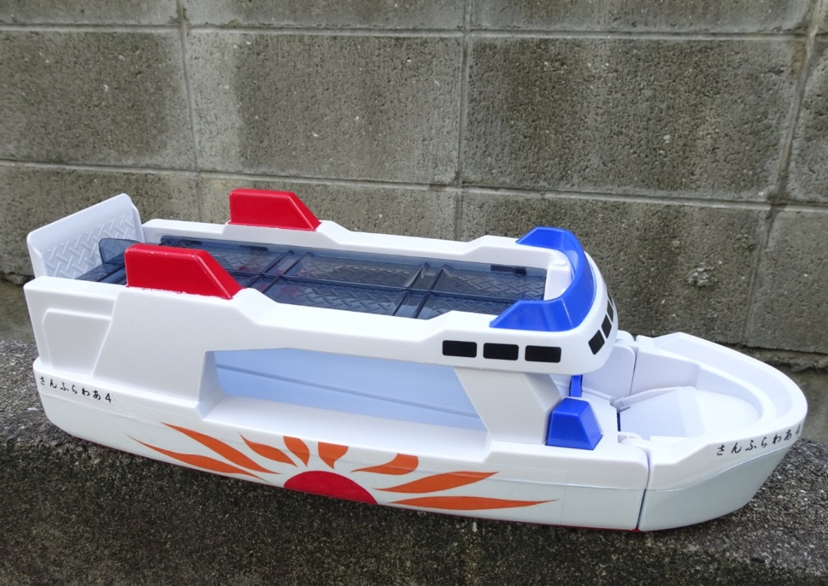 なので、トミカフェリーを購入して、バラして塗装して太陽マークをつけて、4歳なので「さんふらわあ4」として