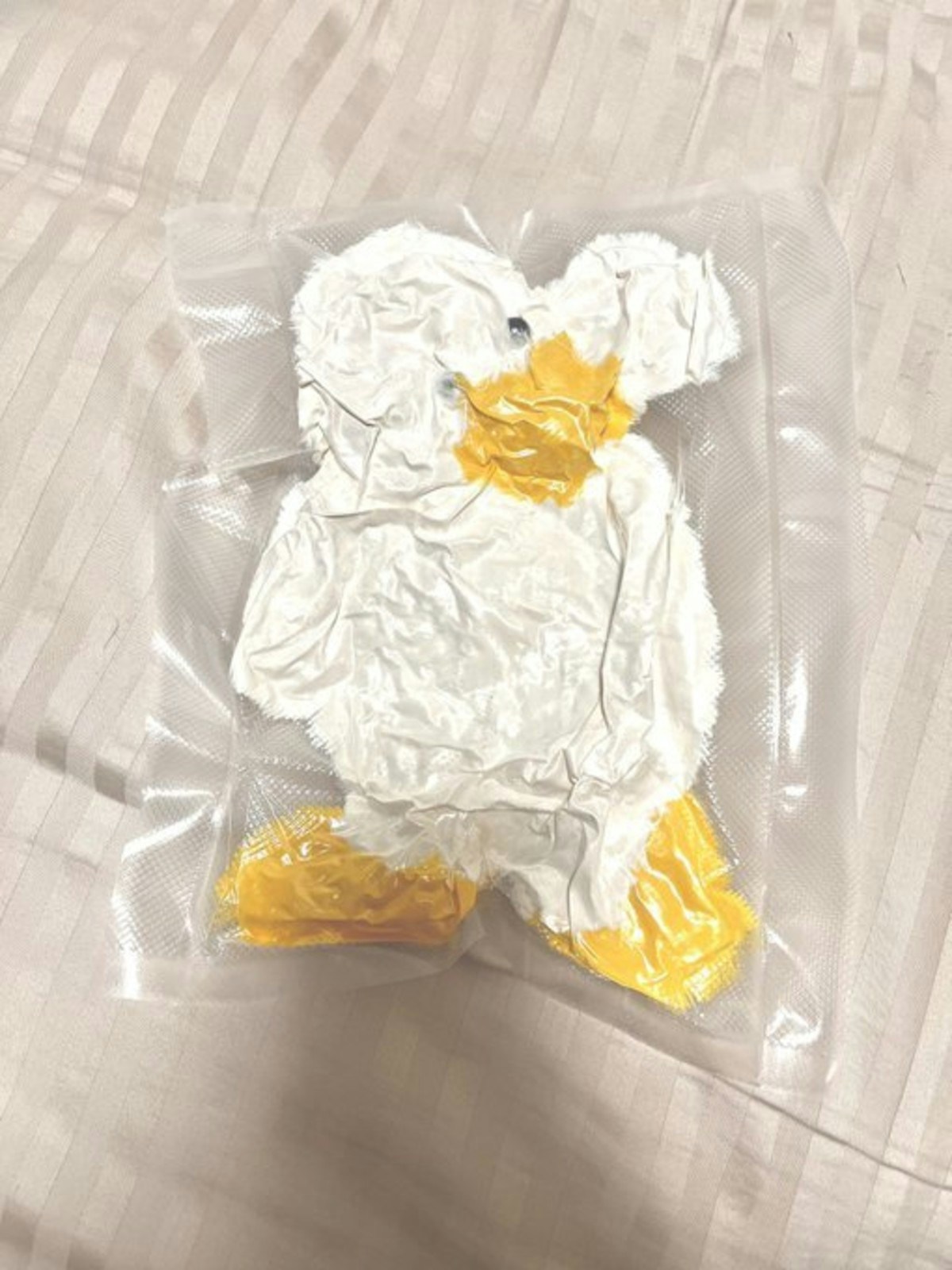 圧縮で届くのは分かっていたものの、箱を開けた瞬間、ペチャンコになったアヒルのぬいぐるみが…。それを見て思わず爆笑。写真を撮らずにはいられないほどの存在感、そして見た目の面白さ。