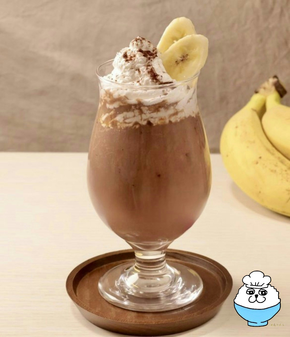 潰したバナナ1本、砂糖大さじ1、無糖ココアパウダー大さじ1をしっかり混ぜたら豆乳150ccを加えグラスに移してホイップクリームを絞って完成!!! ※1