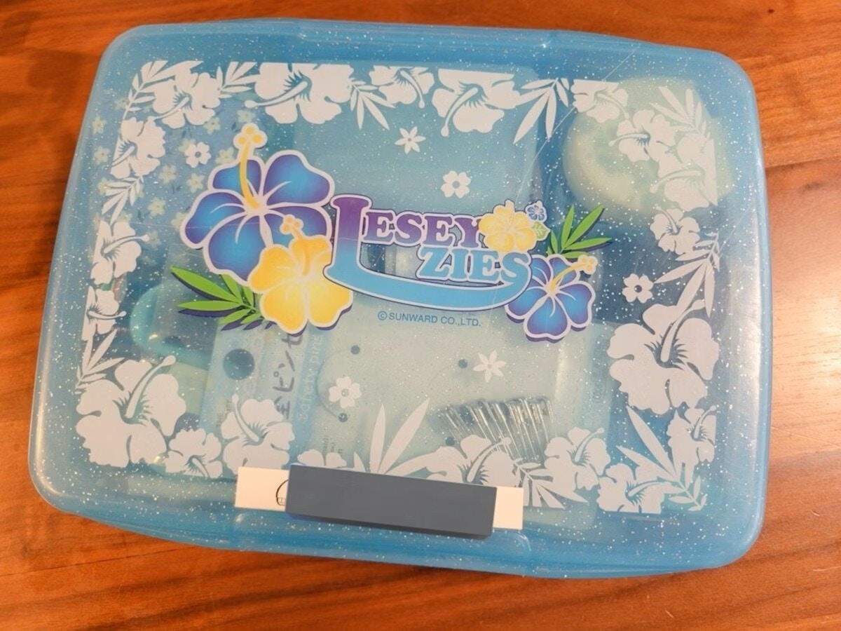 えみさんの自宅で長い間眠っていた裁縫箱はハイビスカスにラメが散りばめられたデザイン。平成生まれであれば懐かしさを感じるデザインではないでしょうか。最近あまり見なくなったように思えるハイビスカスですが、平成ではよく見かけた気がします。