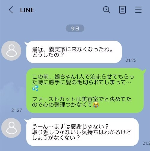 義実家で娘の髪の毛を勝手に切られてしまったことが許せず、それ以来義実家には行っていないという投稿者さん。義妹はそれでもお世話になってるんだからまずは感謝をするべきだと言います。義妹の言いたいことはわかりますが、投稿者さんは自分なりに感謝の気持ちを行動で示していたそうですし、日ごろの様子を見ているわけでもない義妹に言われたら余計なお世話と感じて当たり前だと思います。