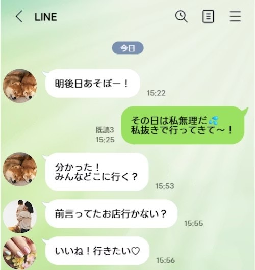 私が大丈夫で、その中の1人とかが「その日は無理だから私抜きでご飯行ってきてー!」って友達が言うと