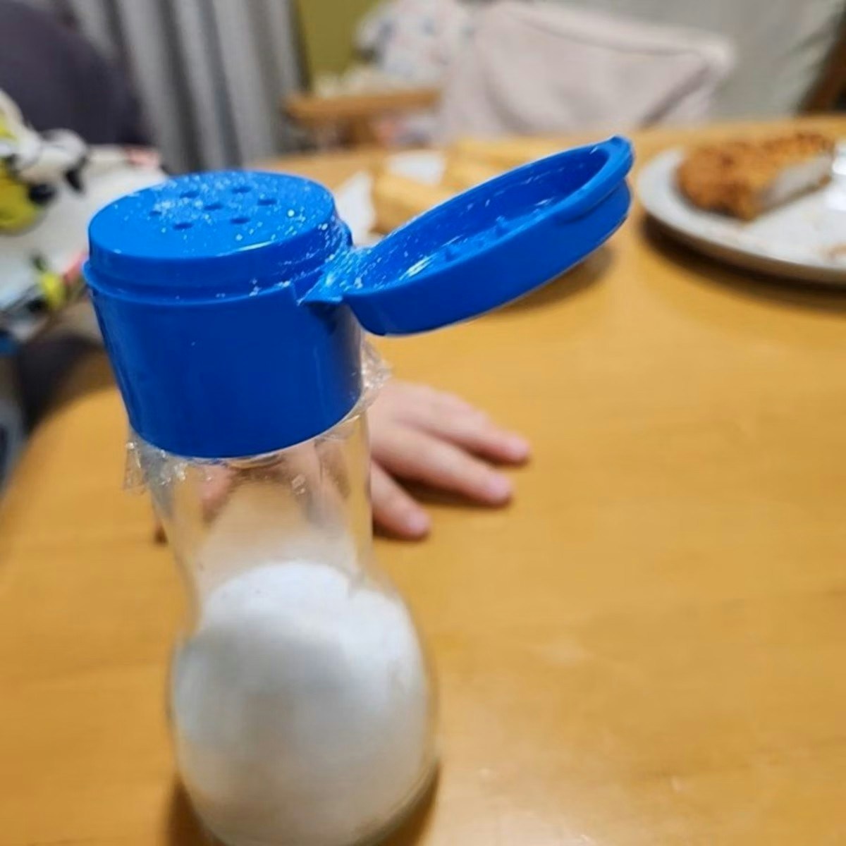 塩に執着しやりたがる2歳児に対する実母の対策がキャップと本体との間にラップかませてて天才。さすが子育て終えている人は違うな… ※2