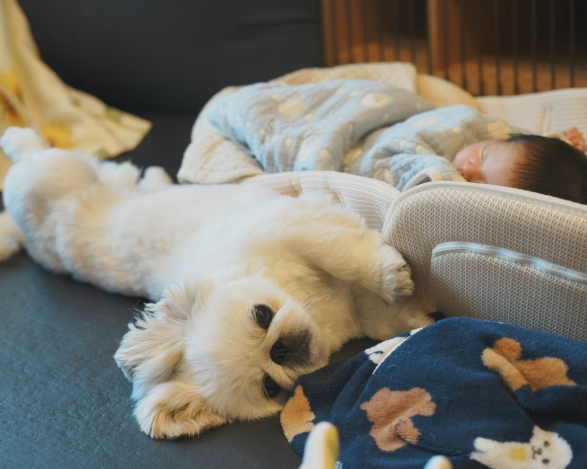 ぬん坊(@numbo_pekingese)さんの投稿です。ペットと暮らしていて、その後赤ちゃんがやってきた場合、ペットたちはどんな反応をするのでしょうか。ヤキモチを焼いたり、寂しがったり、それぞれの反応をするかもしれません。かわいいもの同士、仲良くなるといいですよね。