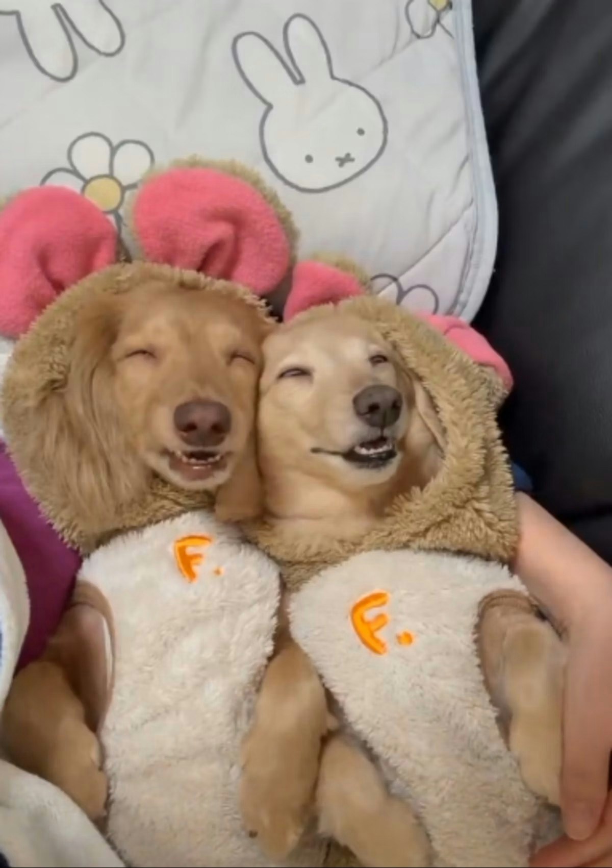 どんな夢を見ている?にっこりと眠る2匹の犬に4万いいね