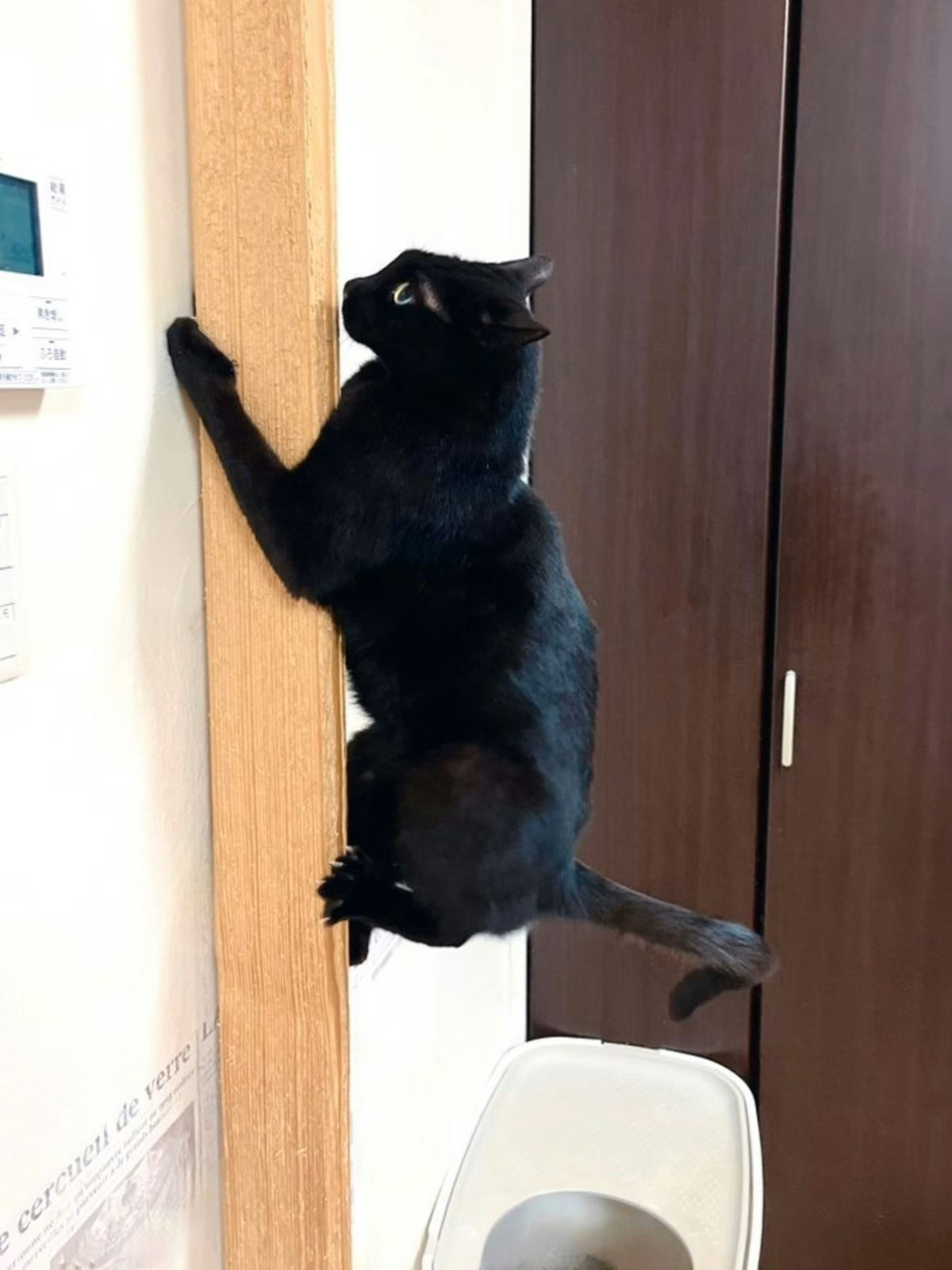 家の柱にしがみ付いていたのは、猫野四季さんの愛猫でした。前足で柱を抱え込み、後ろ足の爪でガッチリと柱につかまっていますね。猫は柱や壁、カーテンなどに登っていきたいのかもしれません。とはいえ、傷がついてしまうので困りものですが…。