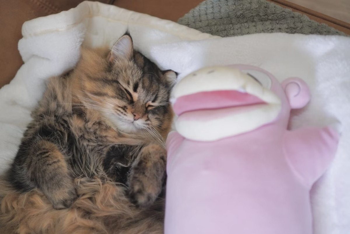ぬいぐるみと寄り添うように眠る猫、とてもかわいいですよね。2人で仲良くお昼寝してどんな夢を見ているのでしょうか。猫がぬいぐるみに顔を寄せているように見えるところが、またとても癒やされます。