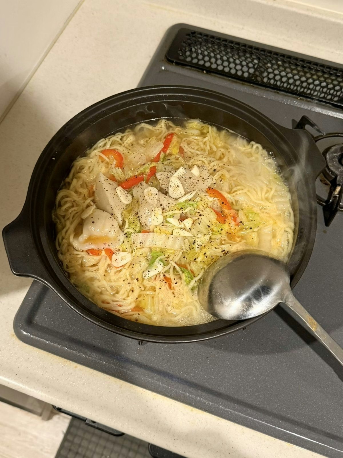 穴井メルさんは塩焼きそば麺を使って、塩ラーメンを作りました。穴井メルさんが使った焼きそば麺はソース付きだったので、溶かすだけでスープができて時短となっていいですね。