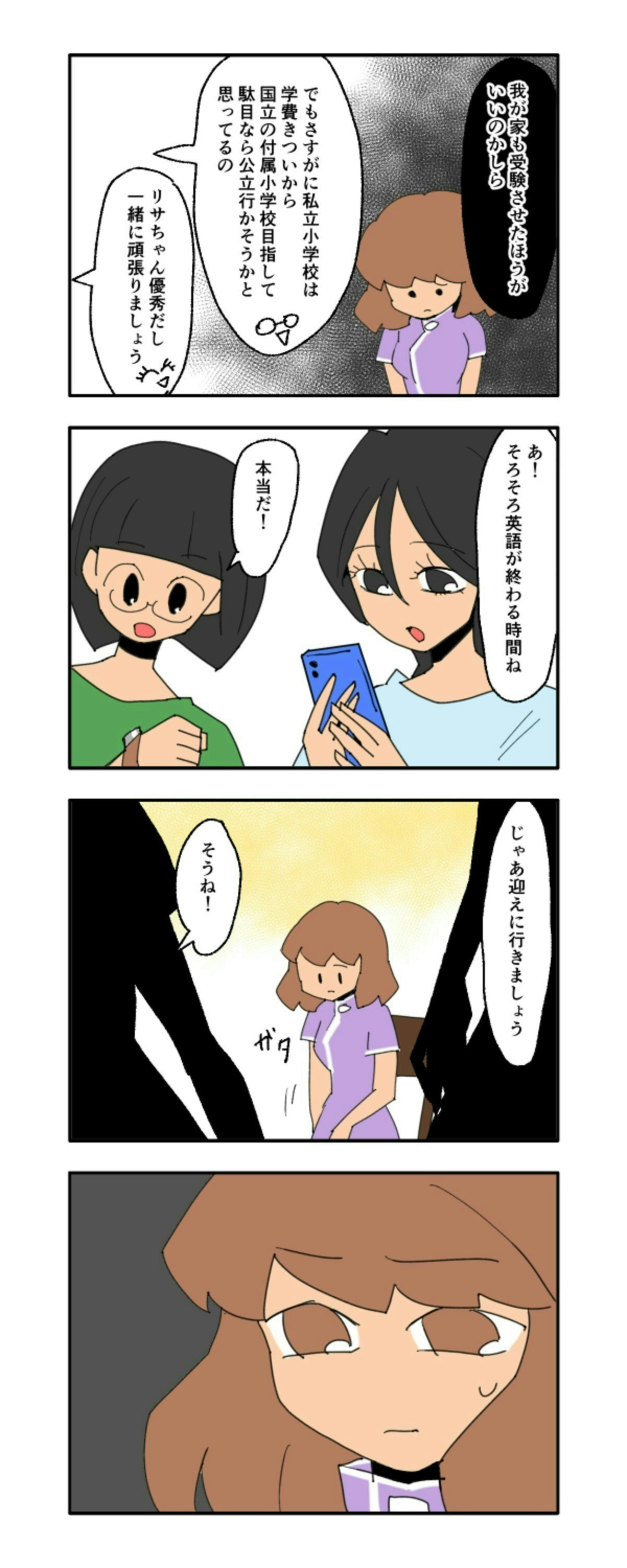 新しい地域での暮らしは治安も良く落ち着いた雰囲気で子育てができていました。ある日、ハルミは同じ年齢の子どもをもつママたちと仲良くなります。その中で、子どもの教育に力を入れる三村さんと高見さんの話を聞き、2人の子どもが通っている英語スクールに自分の息子を入れたハルミ。