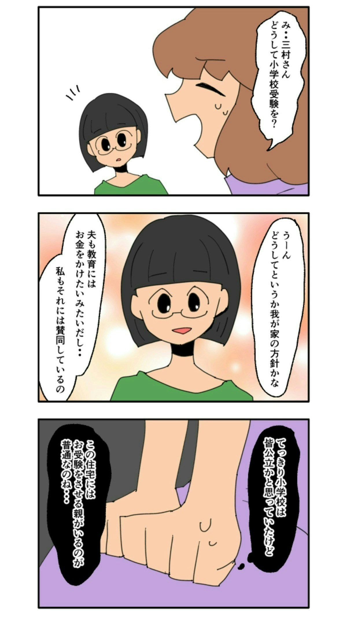 この英語スクールのある日は、スクールの時間が終わるまでカフェでお茶タイムを過ごすのが習慣になっていました。そこでハルミは三村さんと高見さんが子どもにいくつも習いごとをさせているのは「小学校受験を見据えているから」と聞いて驚愕します。