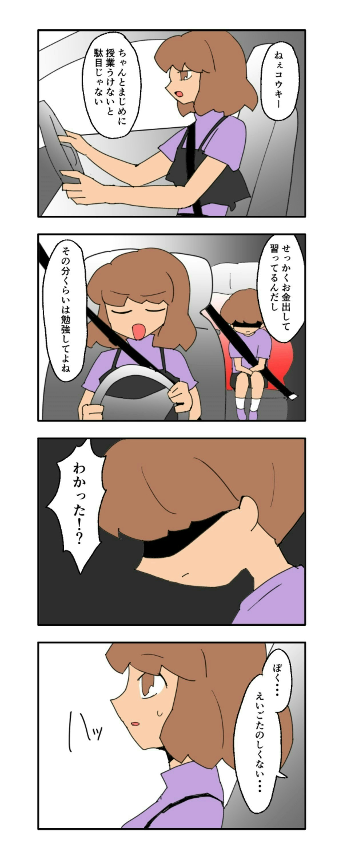 コウキには自分の見栄のために我慢して英語スクールを続けさせたハルミ。ある程度慣れてきたころにコウキは真面目に授業を受けられるようになりましたが、自分が希望していないことを一生懸命続けたコウキをハルミがたくさん褒めているといいのですが…。