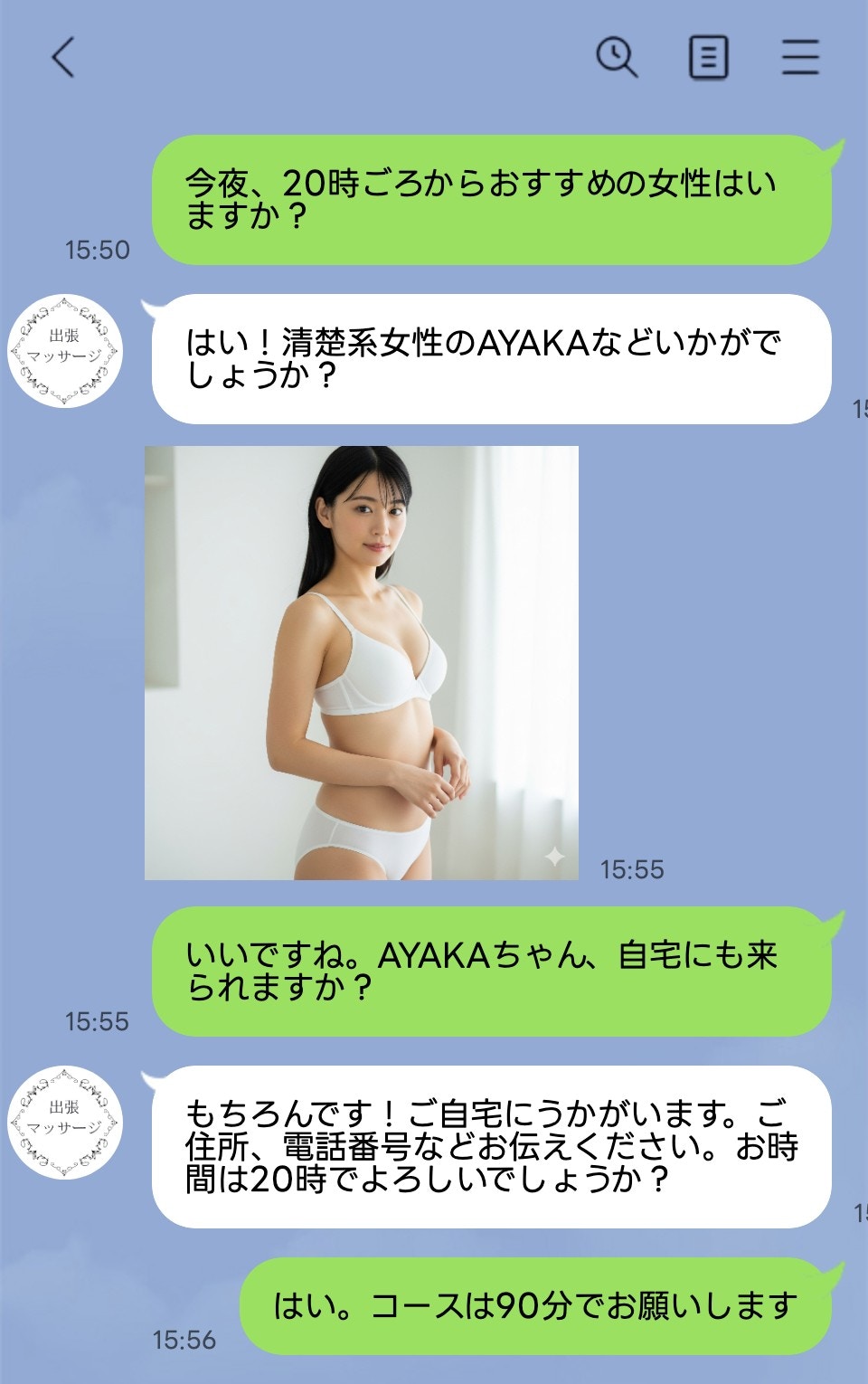 『もちろんです!ご自宅にうかがいます。ご住所、電話番号などお伝えください。お時間は20時でよろしいでしょうか』