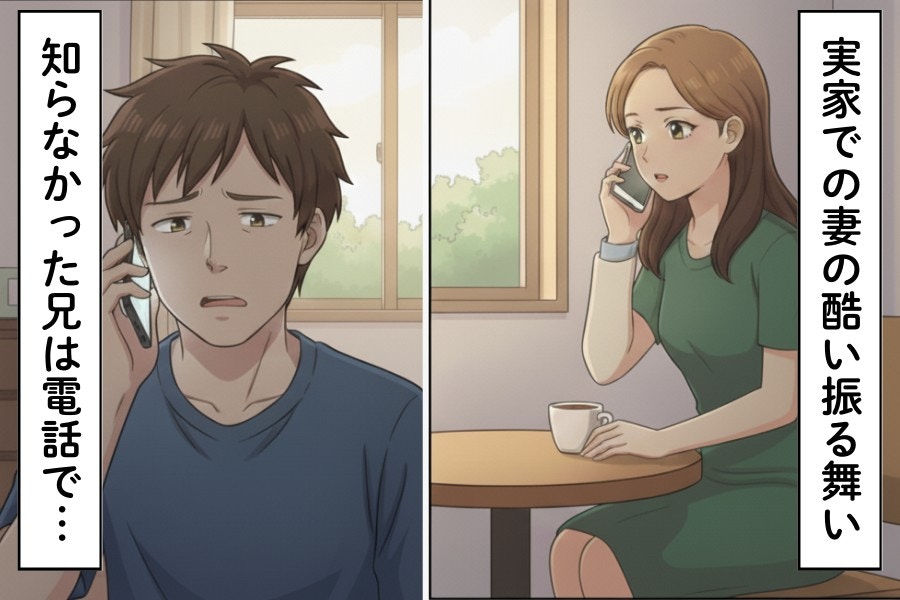 カフェでの話し合い後、ゆみこから連絡を受けた兄がさとみに電話をかけてきました。兄は妻・ゆみこが両親に家事育児を丸投げしていたことを知らず、事の真相に驚き、ショックを受けたようです。さとみの話を聞いた兄は、自分も行動を起こすと発言します。