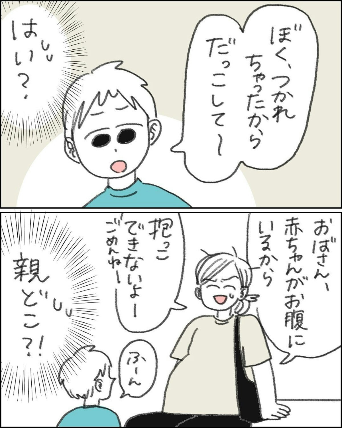 男の子は、父親に抱っこされ、甘えている娘のえっちゃんを見て、妊娠中のなこさんに抱っこをせがみました。