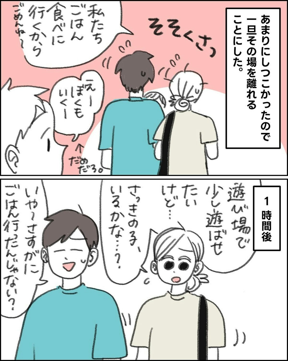 遊び場で出会った男の子は、その後も なこさん一家につきまといます。あまりにもしつこかったため、一度、その場を離れます。1時間後に戻ってくると…。