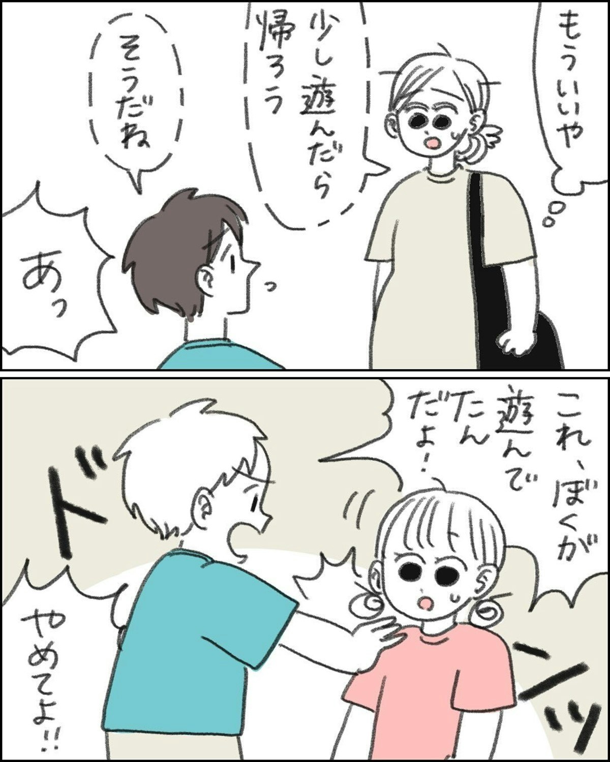 食事を終え、遊び場に戻った なこさん一家。すると、まだ、あの男の子がいます。そして、おもちゃで遊び始めた娘のえっちゃんを突き飛ばしてしまいました…。