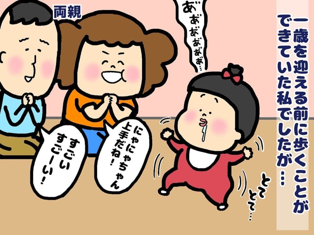 1歳を迎えるころには歩けていた主人公。けれども成長とともに、転びやすさや動きのぎこちなさに両親は違和感を抱きます。