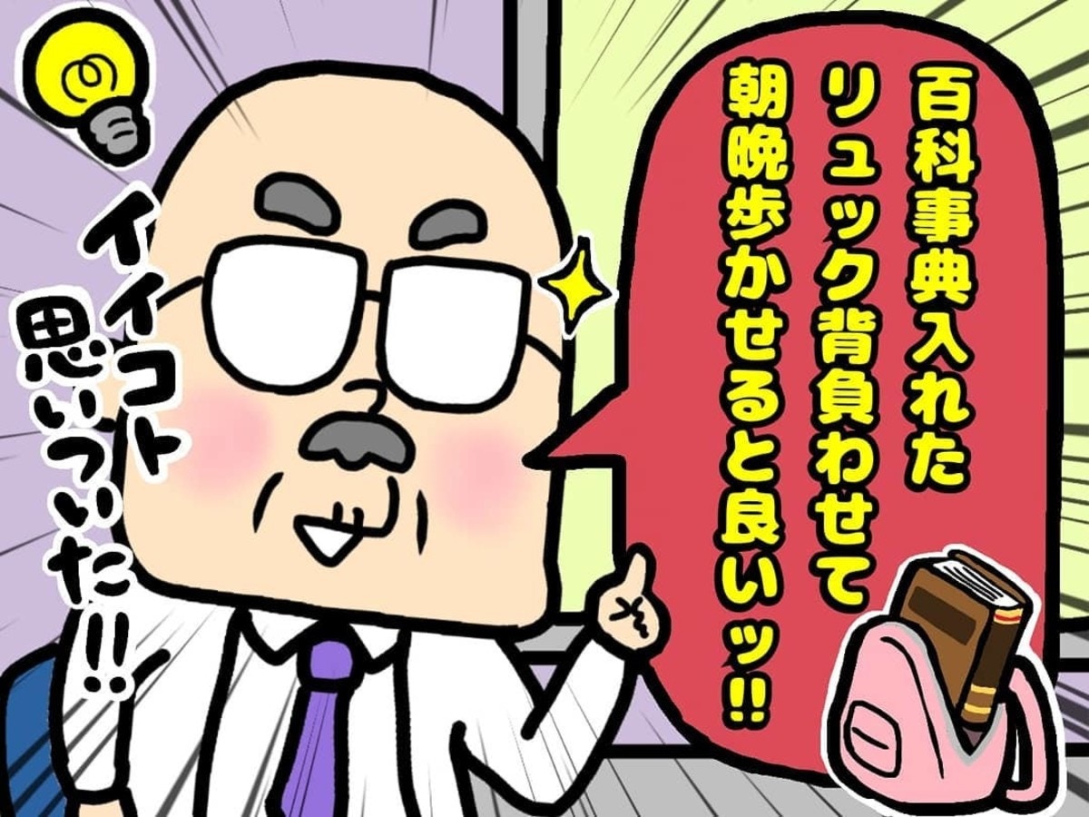 すると医師は、足が細すぎる主人公を見て「百科事典を入れたリュックを背負わせて歩かせると良い」と助言しました。
