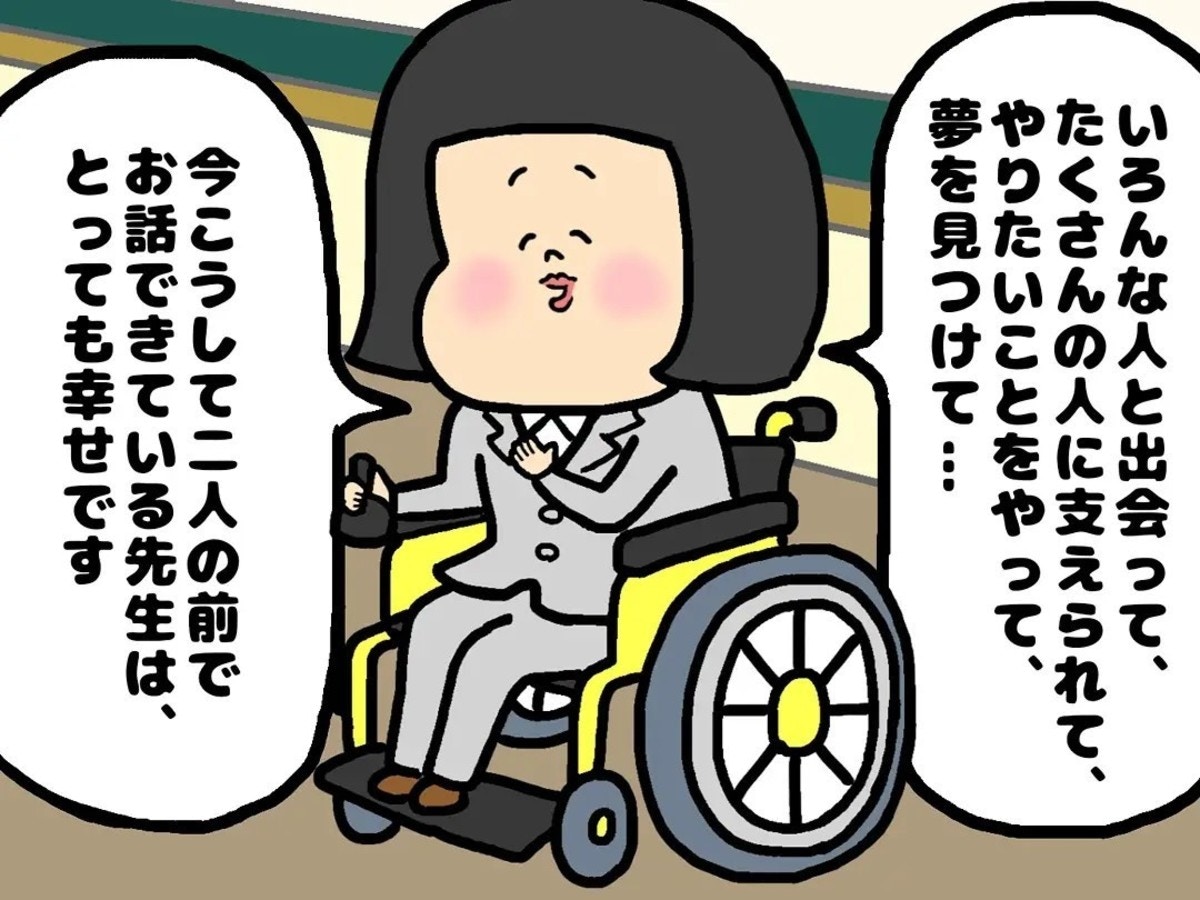主人公は不自由な身体や体調の限界に悩みながらも、家族や仲間、生徒との出会いに支えられ、夢に向かって一歩ずつ前へ進み夢を叶えました。