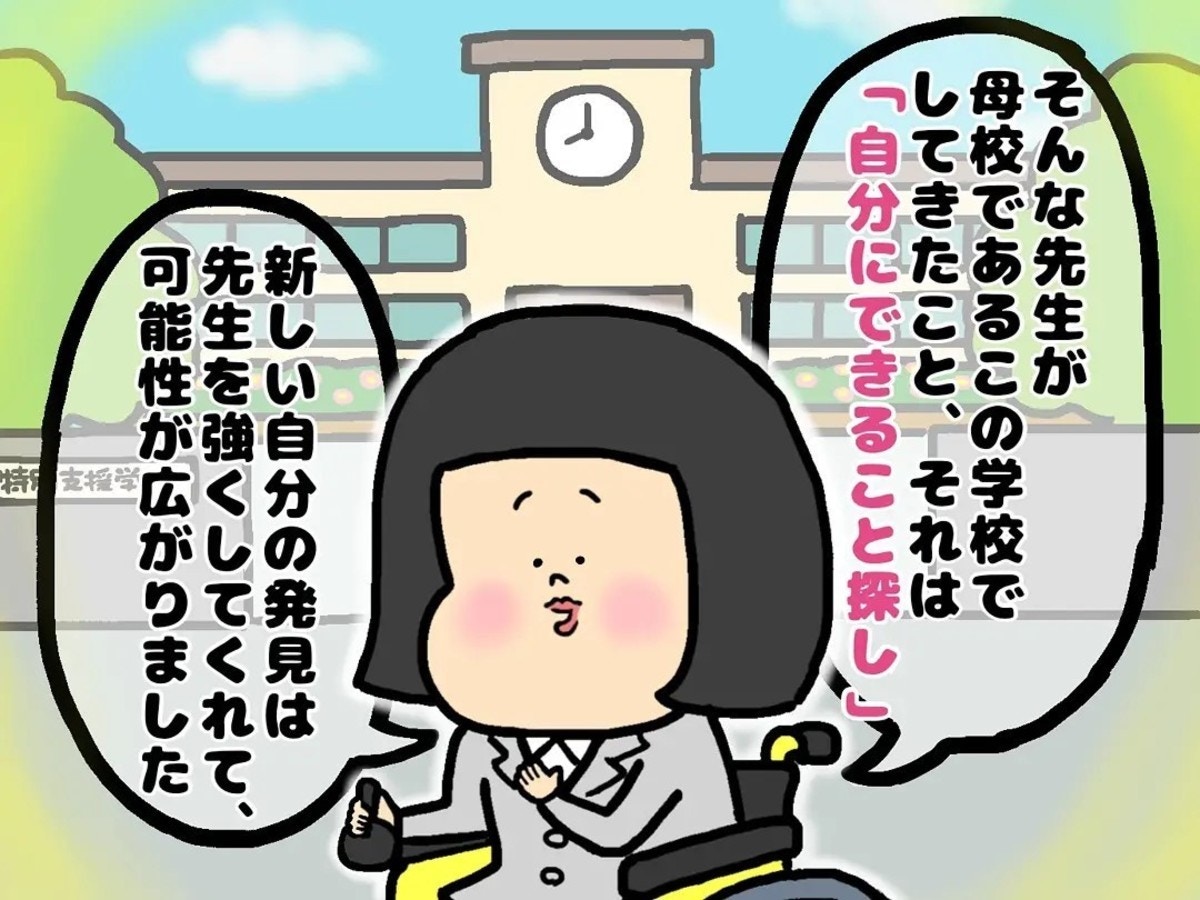 主人公は、自分が母校で経験した「できないこと」ではなく「できること」を探す大切さを生徒たちに伝えました。
