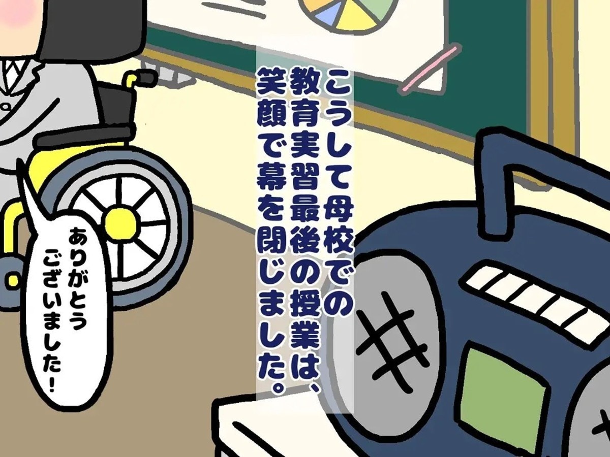 生徒の言葉に励まされ、教育実習最後の授業を笑顔で終えた主人公。