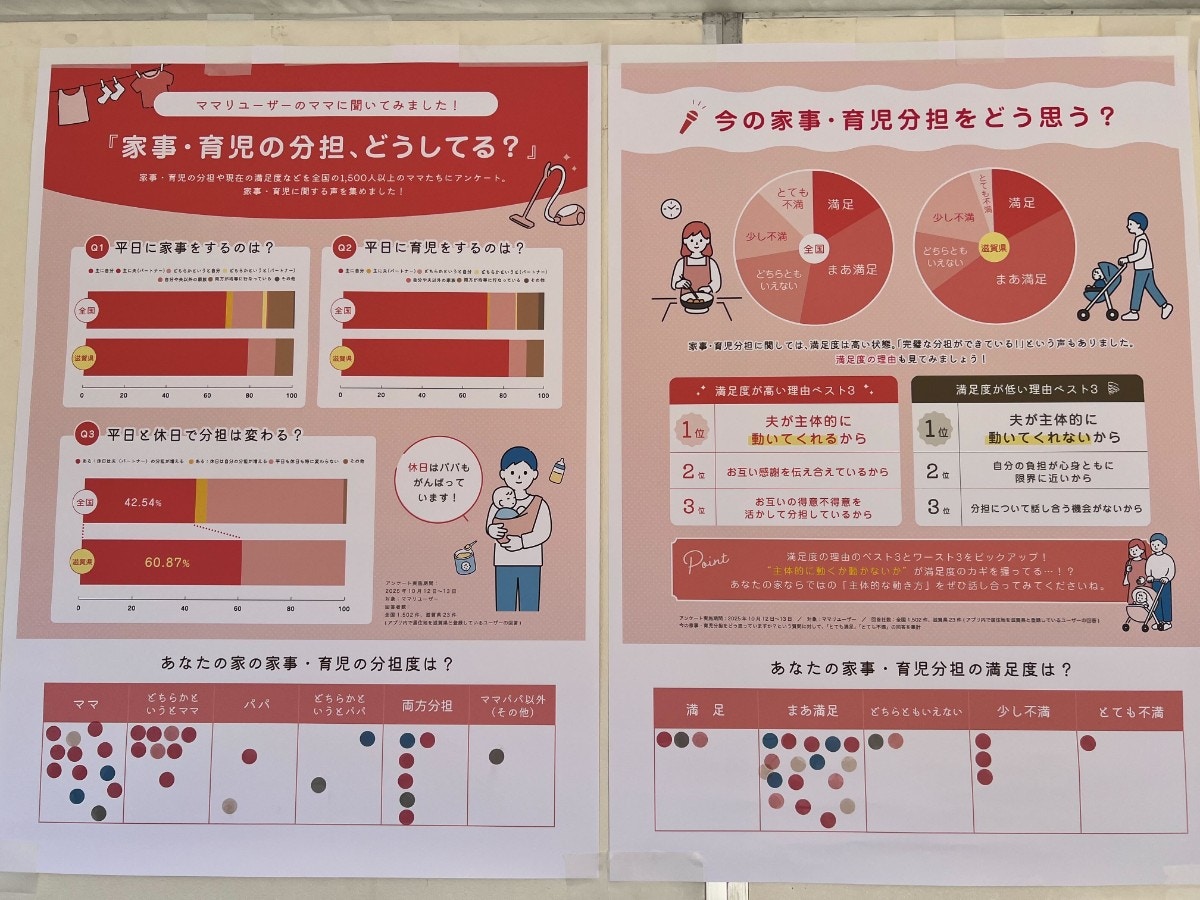 ブース1とブース2では、大津市版の家事シェアシートを実際に体験したり、「家事・育児」に対するパパ・ママのリアルな声やデータの展示も。滋賀県と全国の比較などもあってみんな興味深そうに眺めていましたよ。