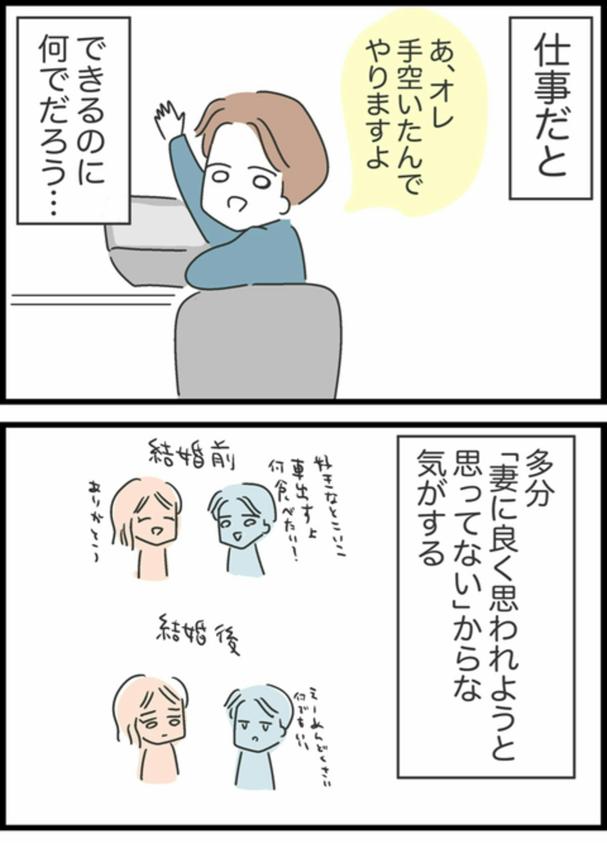 しょうたは自分自身を振り返り、家事も育児も苦痛に感じてしまう理由を考えます。しょうたは、家事や育児に見返りを求めていたようです。