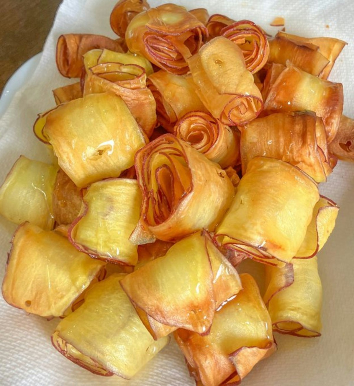 さつまいもをスライサーで薄く切り、丸めて爪楊枝で固定。180℃の油でこんがり黄金色になるまで揚げ、ハチミツをかけると、カリッと美味しく仕上がります ※1