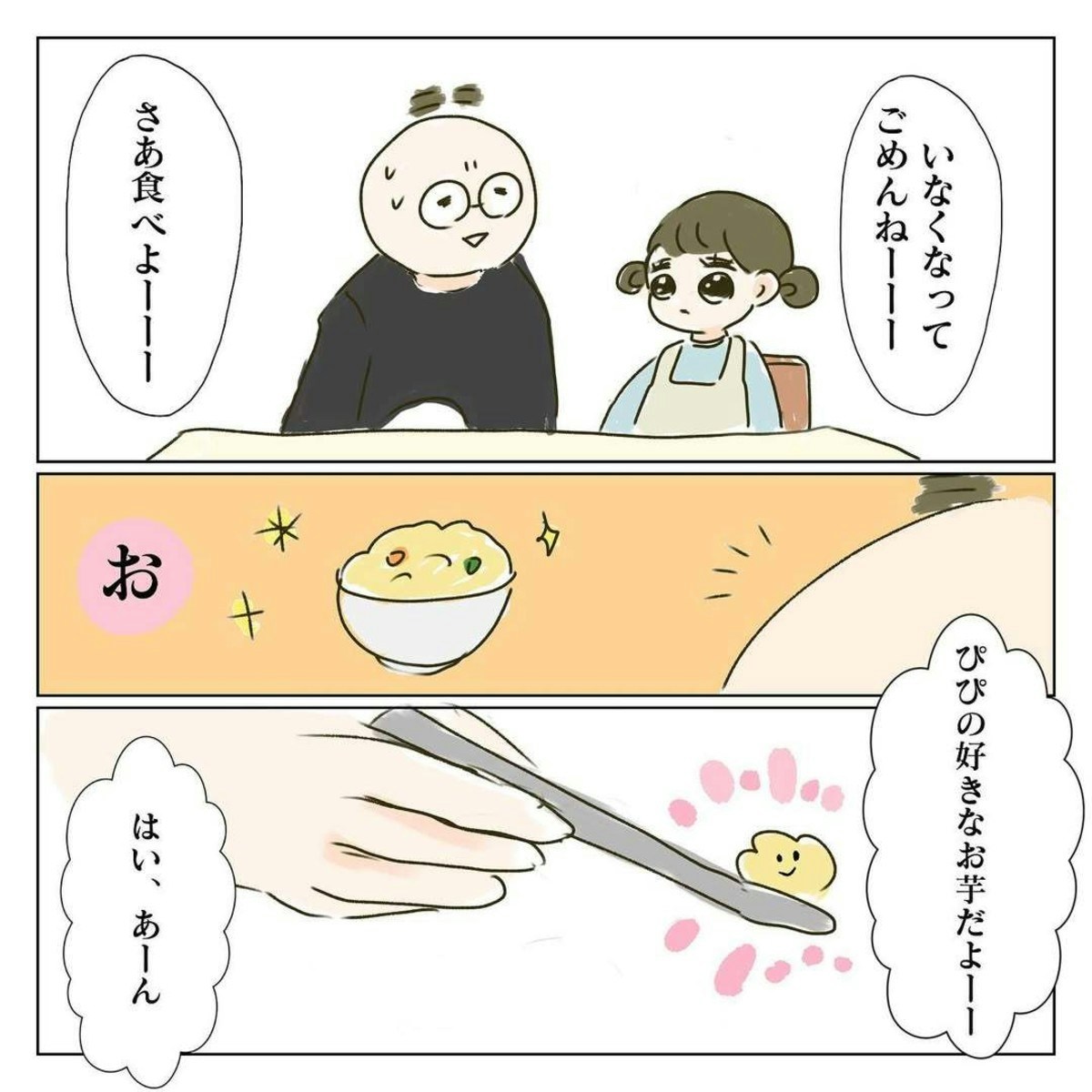 剥がれ鱗さんは、ぴぴちゃんが大好きなお芋のおかずを、彼女の口元に運びました。