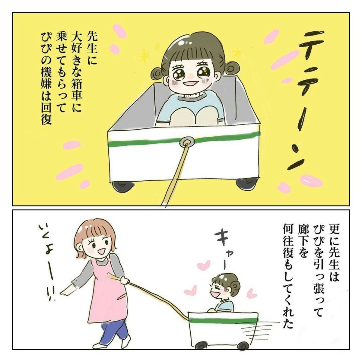 給食の時間にも、ぴぴちゃんは泣き続けていました。その後、先生と一緒に大好きな箱車で遊んだことで、機嫌が良くなりました。