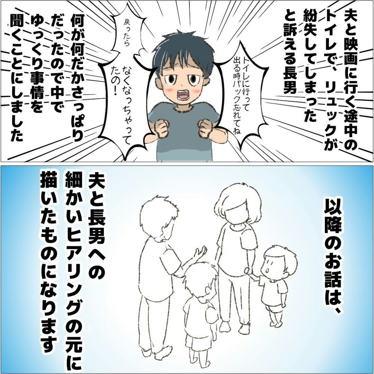 この作品は、おはぎさんの長男・にいくんが、映画館へ向かう途中で置き引きの被害に遭った実体験を描いています。にいくんは、最寄り駅のトイレにSwitchやソフトが入ったリュックを置き忘れてしまいました。すぐにパパとトイレへ戻ると、すでに誰かが個室に入っていました。ふたりは約10分間その人が出てくるのを待ちましたが、出てきた時にはリュックはなく、長男の傘だけが残されていたそうです。