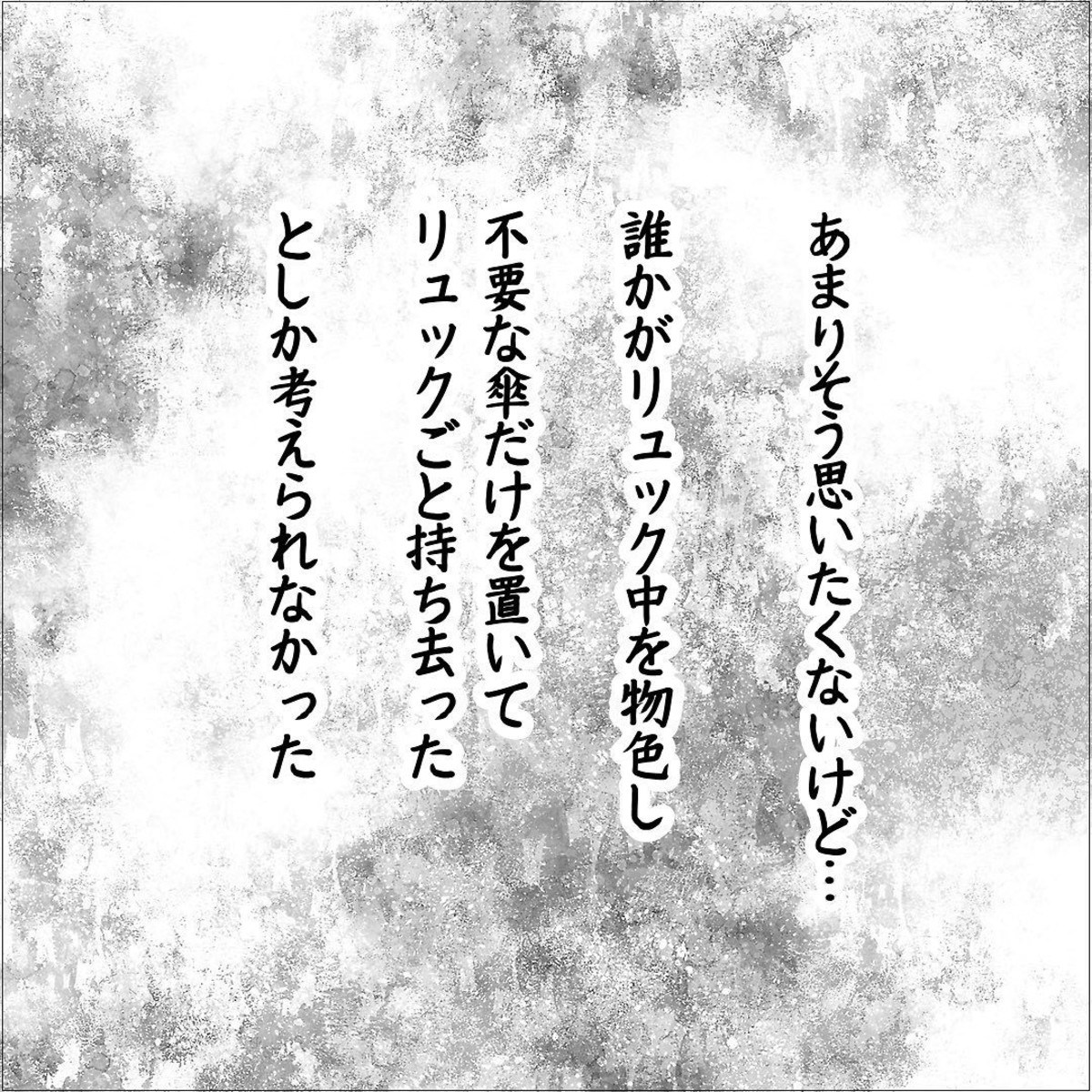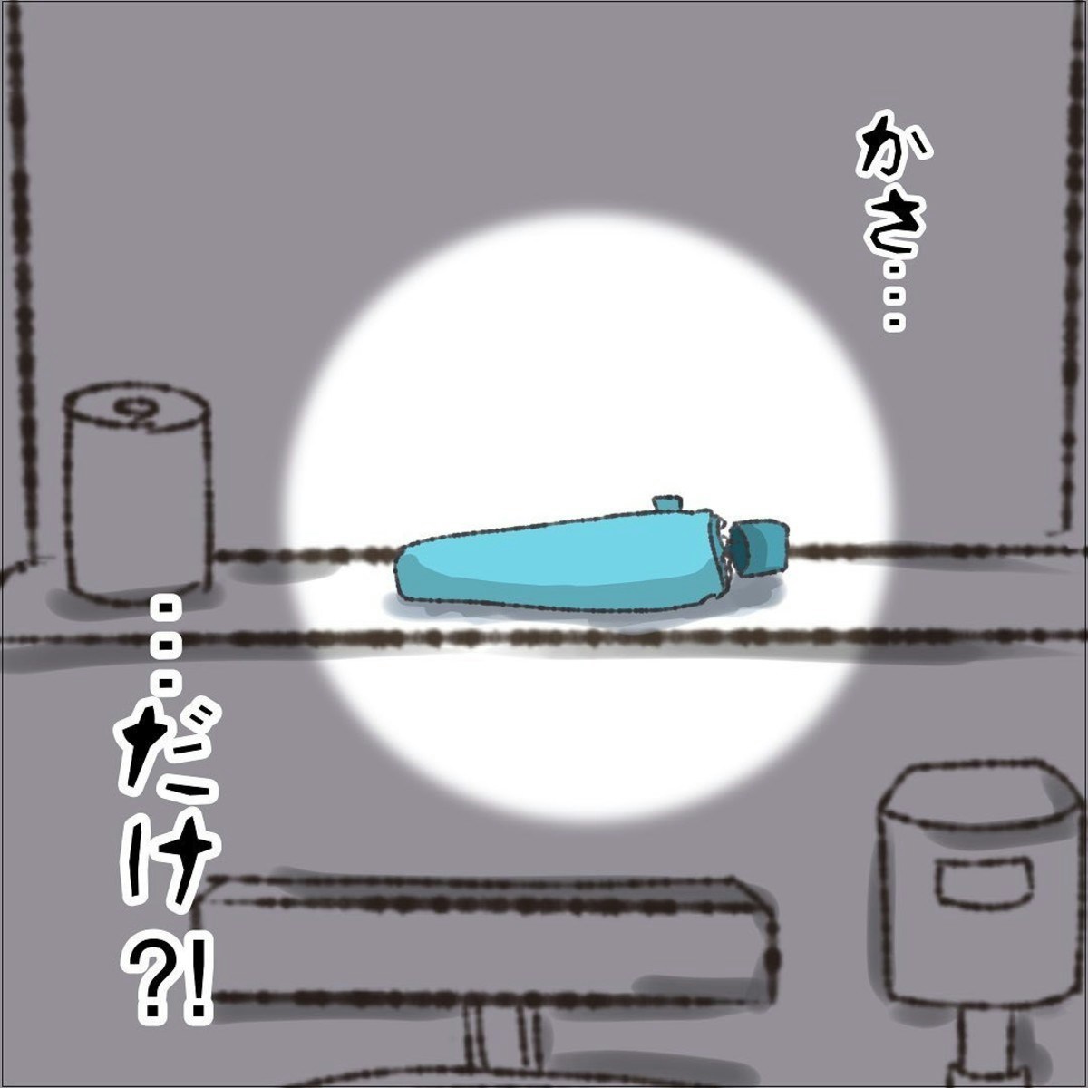 トイレの中には、長男の折り畳み傘だけが残されていました。パパは不思議に思い、先ほどトイレから出てきた人にリュックについて尋ねました。