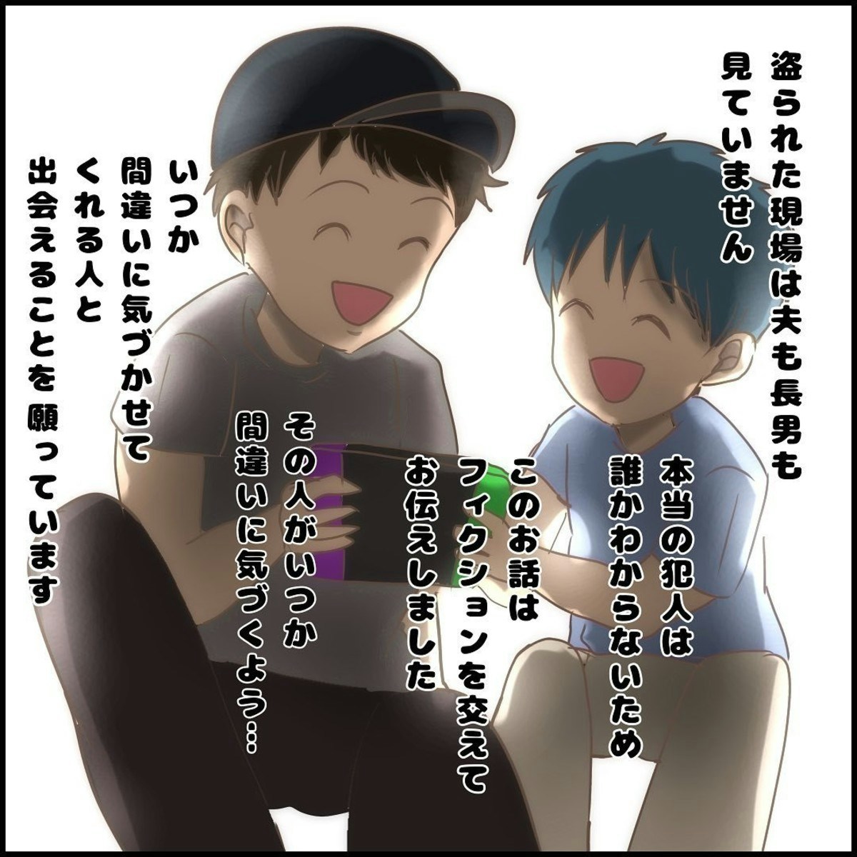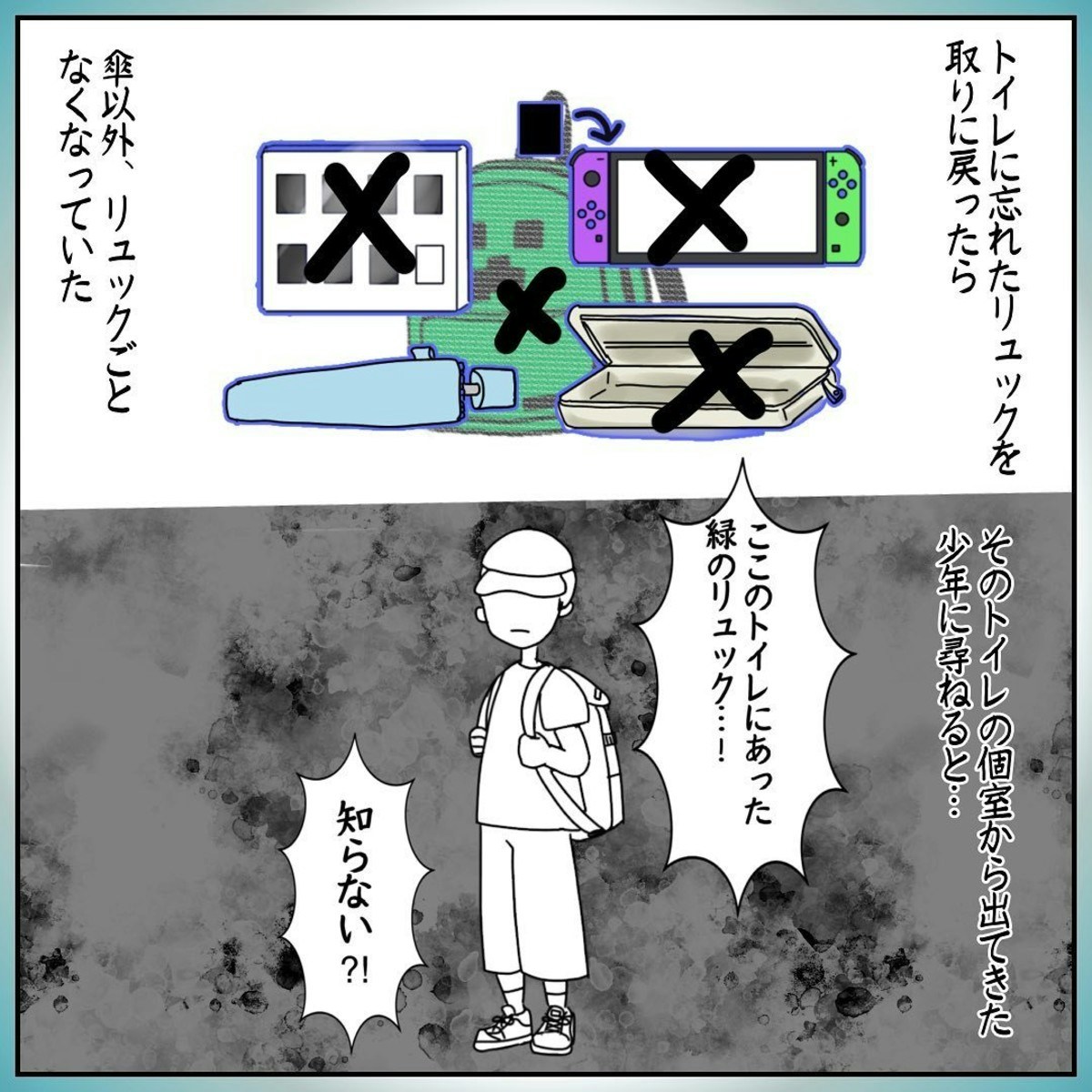 この作品は、おはぎさんの長男・にいくんが、映画館へ向かう途中で置き引きの被害に遭った実体験を描いています。にいくんは、最寄り駅のトイレにSwitchやソフトが入ったリュックを置き忘れてしまいました。すぐにパパとトイレへ戻ると、すでに誰かが個室に入っていました。ふたりは約10分間その人が出てくるのを待ちましたが、出てきた時にはリュックはなく、長男の傘だけが残されていたそうです。