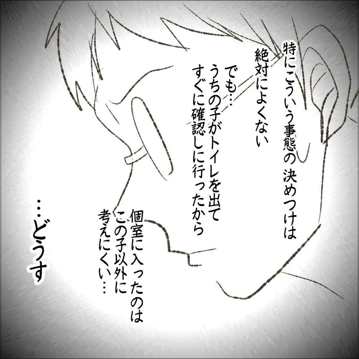 にいくんとパパがトイレに戻ると、そこにはもうリュックがなく、折り畳み傘だけが残されていました。そこでパパは、ちょうどトイレの個室から出てきた少年に声をかけました。