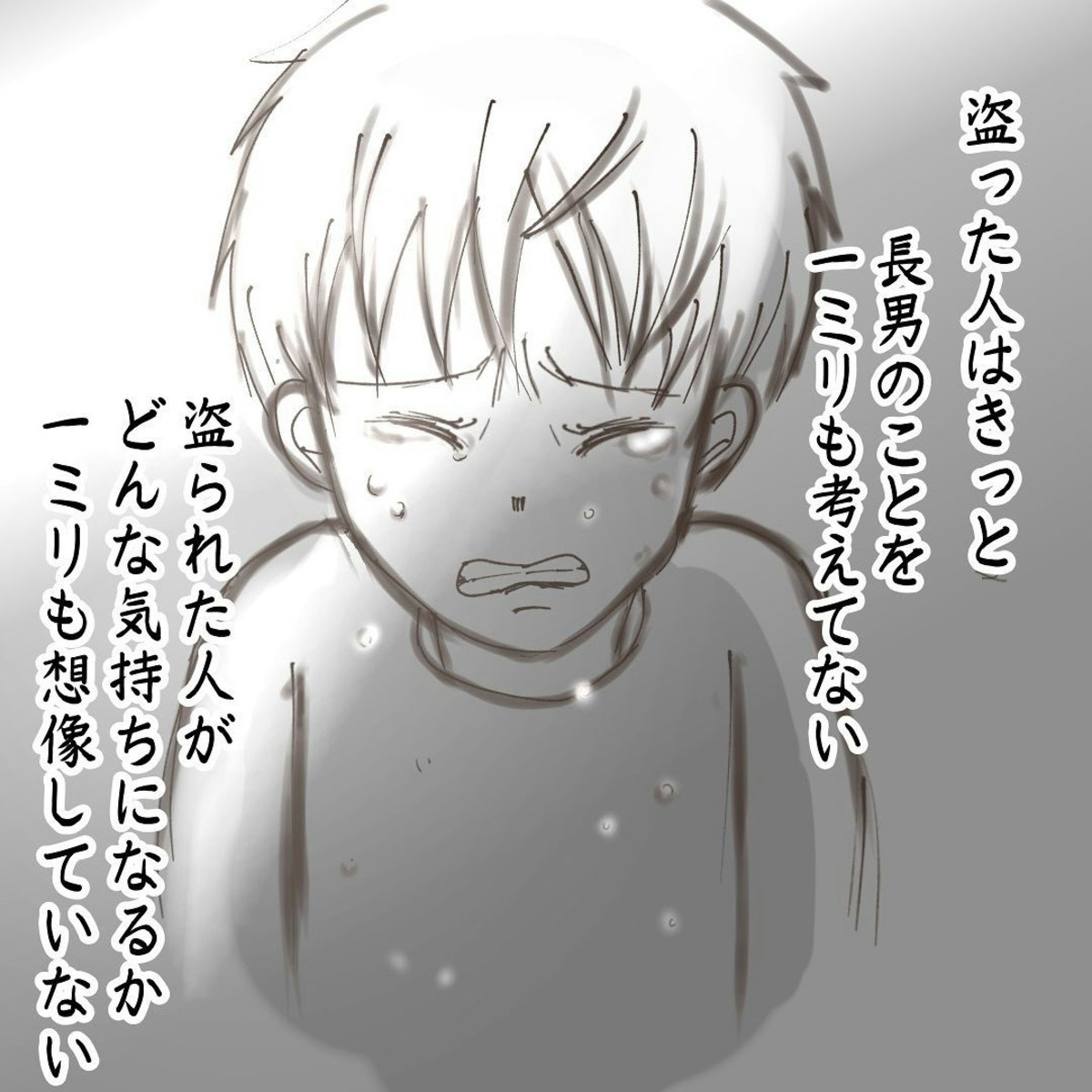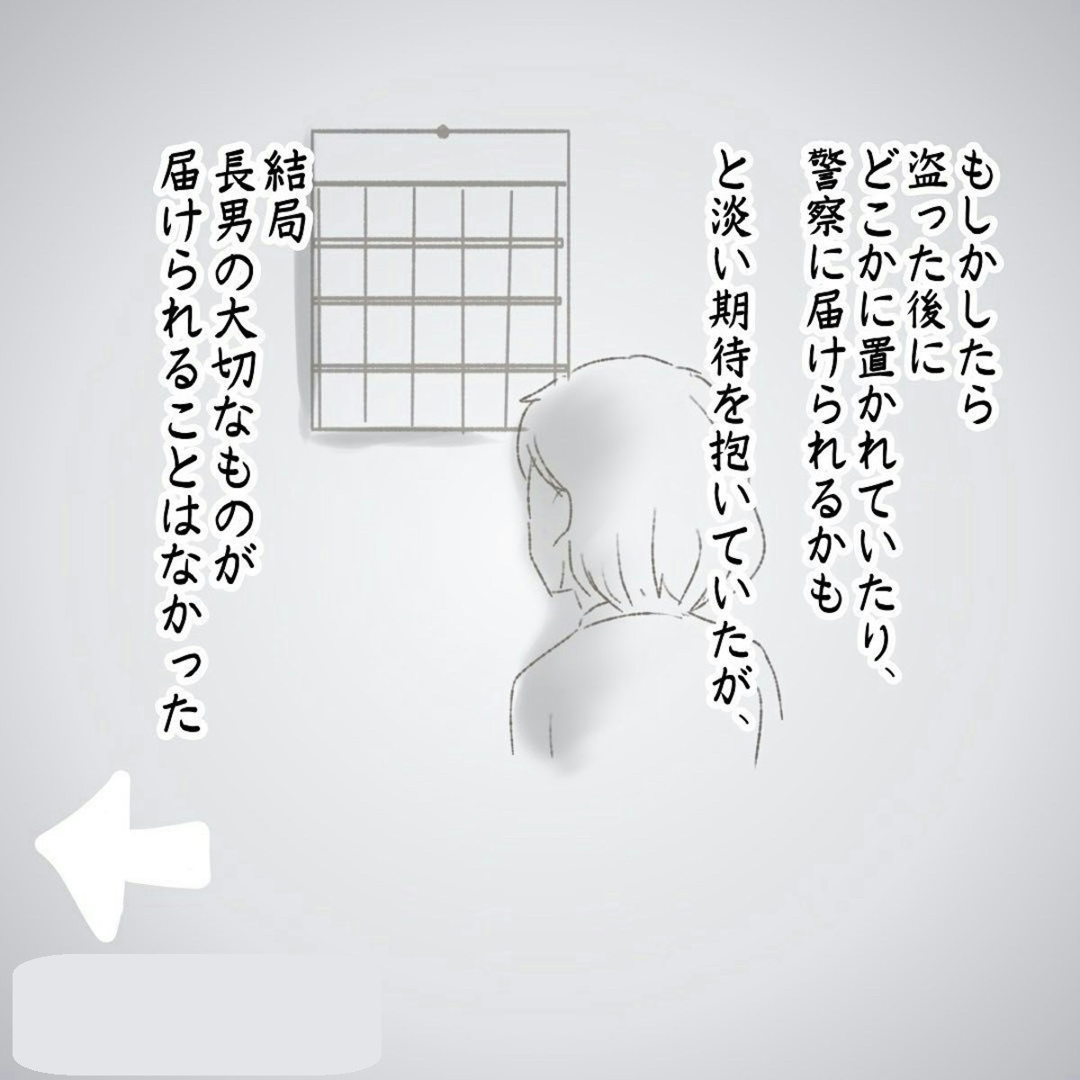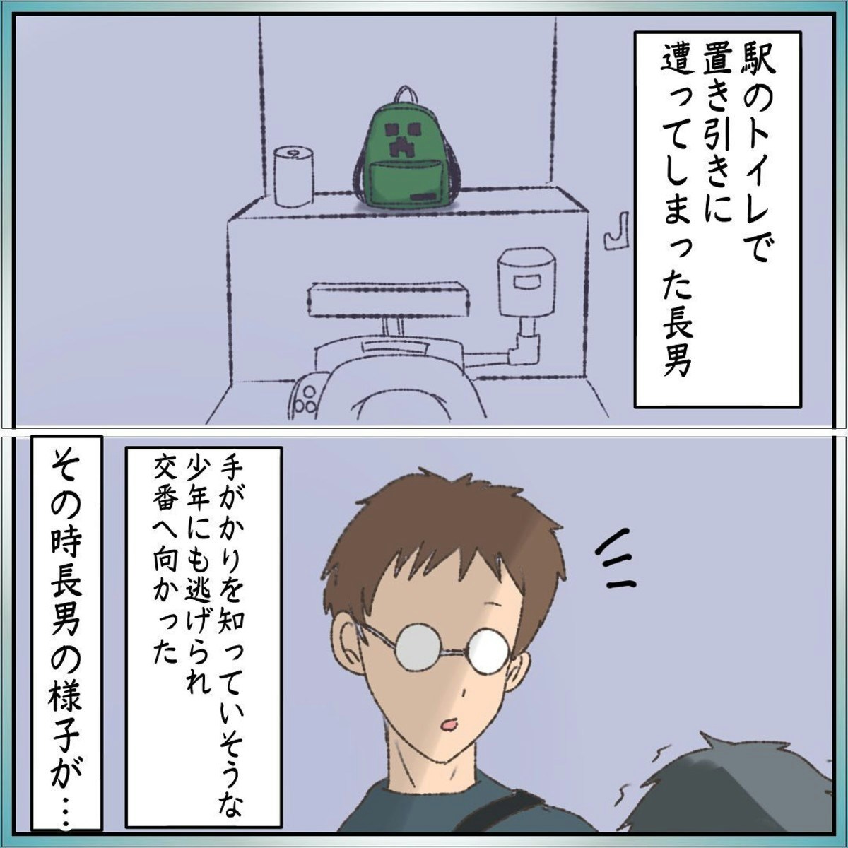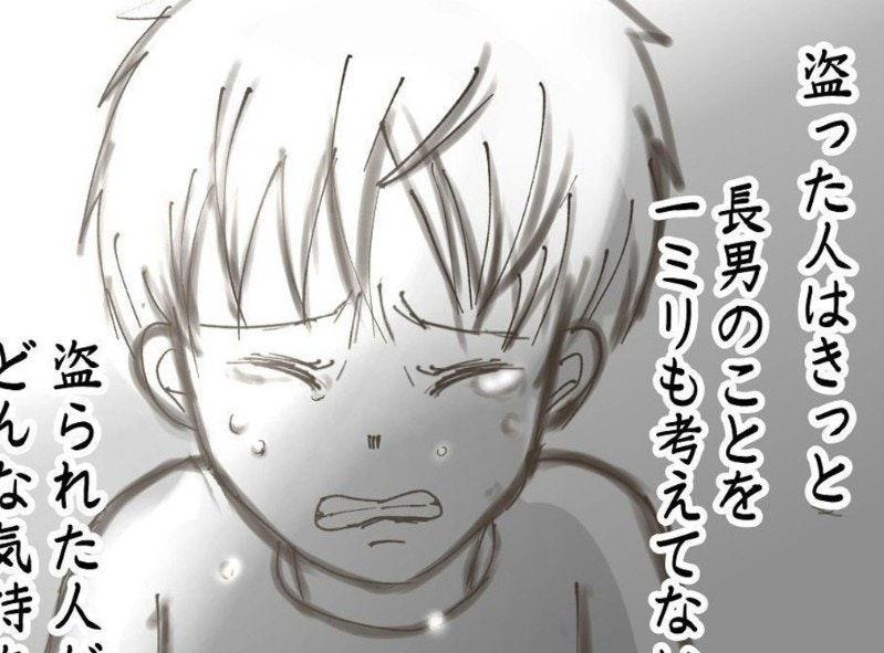 この作品は、おはぎさんの長男・にいくんが、映画館へ向かう途中で置き引きの被害に遭った実体験を描いています。にいくんは、最寄り駅のトイレにSwitchやソフトが入ったリュックを置き忘れてしまいました。すぐにパパとトイレへ戻ると、すでに誰かが個室に入っていました。ふたりは約10分間その人が出てくるのを待ちましたが、出てきた時にはリュックはなく、長男の傘だけが残されていたそうです。