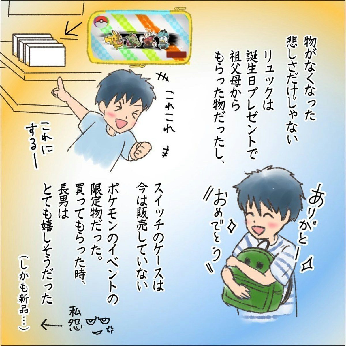 盗まれてしまったリュックは、祖父母から誕生日プレゼントとしてもらった思い出の品でした。また、スイッチのケースも、イベントでやっと手に入れた特別なグッズです。そのため、長男はとても悔しくて涙を流しました。