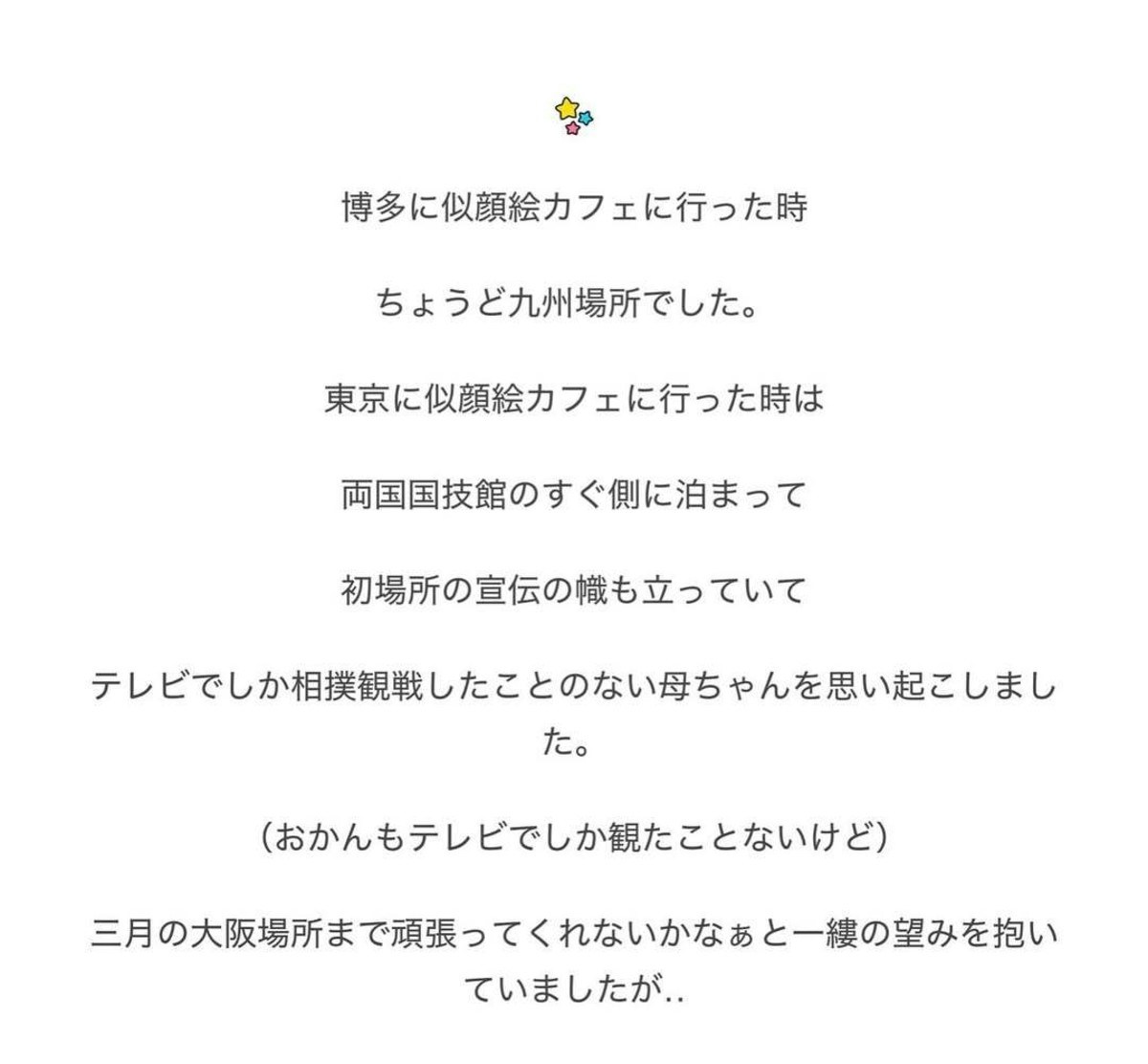 母親がホスピスで療養していた時は体調がとても悪く、おかんさんは元気づけたい一心で、「春場所は一緒に観に行こうね」と声をかけました。