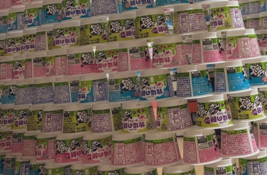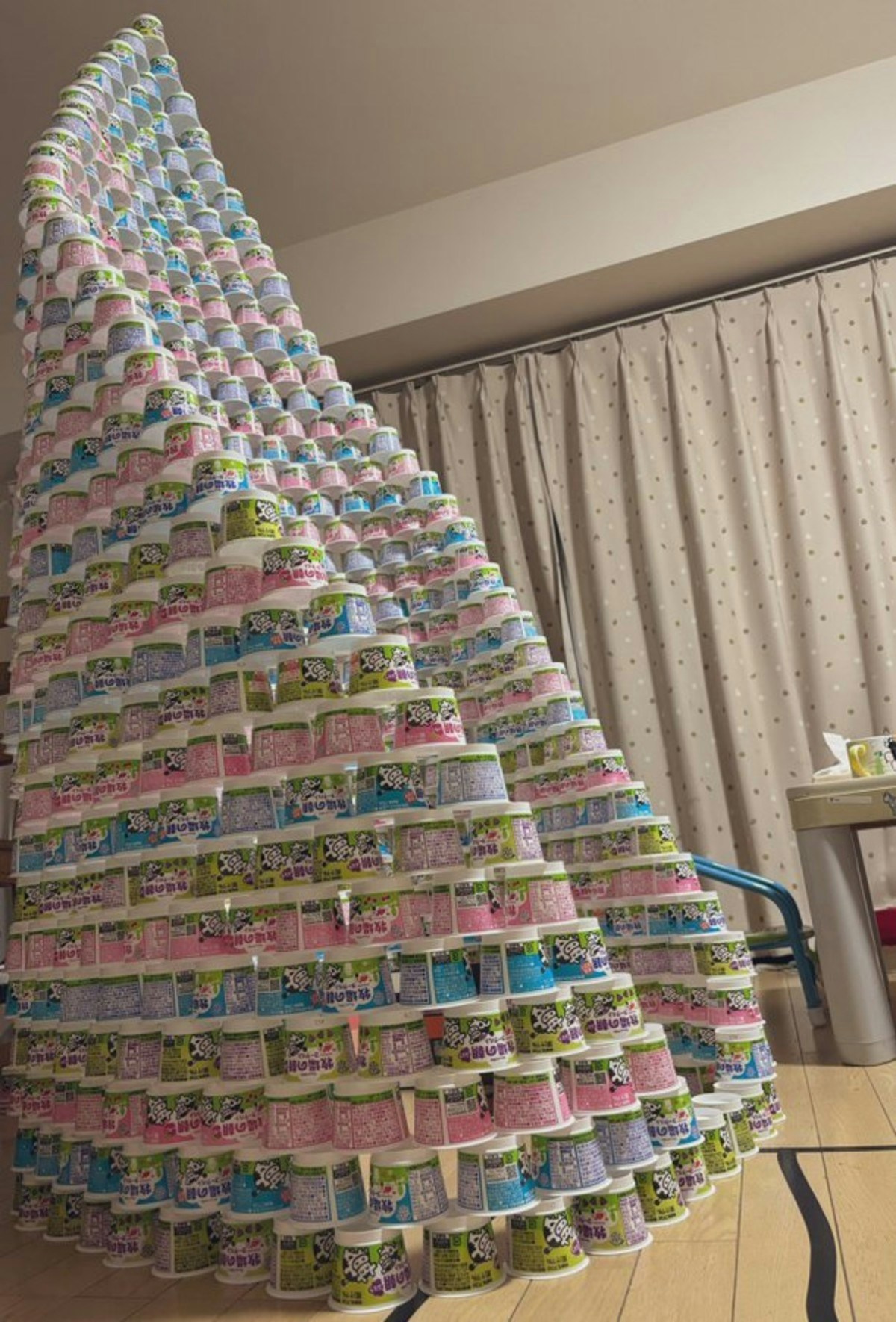 コツコツ集めたヨーグルトカップを積み上げ、特大タワーに!