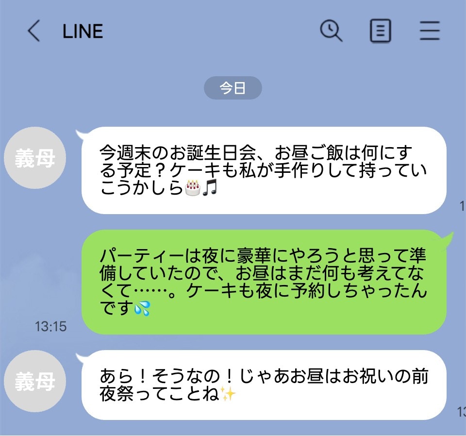 夜に家族でゆっくりお祝いしようと考えていた投稿者さんにとって、義母からの「お昼はどうするの?」という連絡は予想外だったようです。義母としては孫の誕生日を一緒にお祝いしたいという純粋な善意から出た言葉かもしれませんが、当日の準備を一手に引き受けるママとしては、正直「そこまで手が回らない!」と焦ってしまうのも無理はありません。
