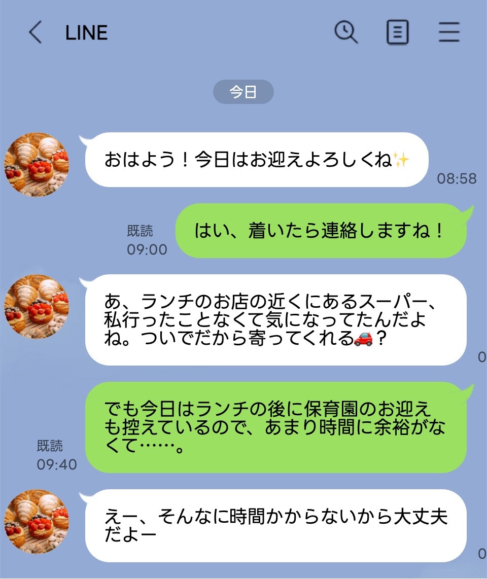 ランチの場所が分からないとのことなので私が車で迎えに行くのですが、ランチ帰りにその近くのスーパーに行ったことがなくて行ってみたいから寄ってもらえない?とか当日の朝にLINEが来て😅