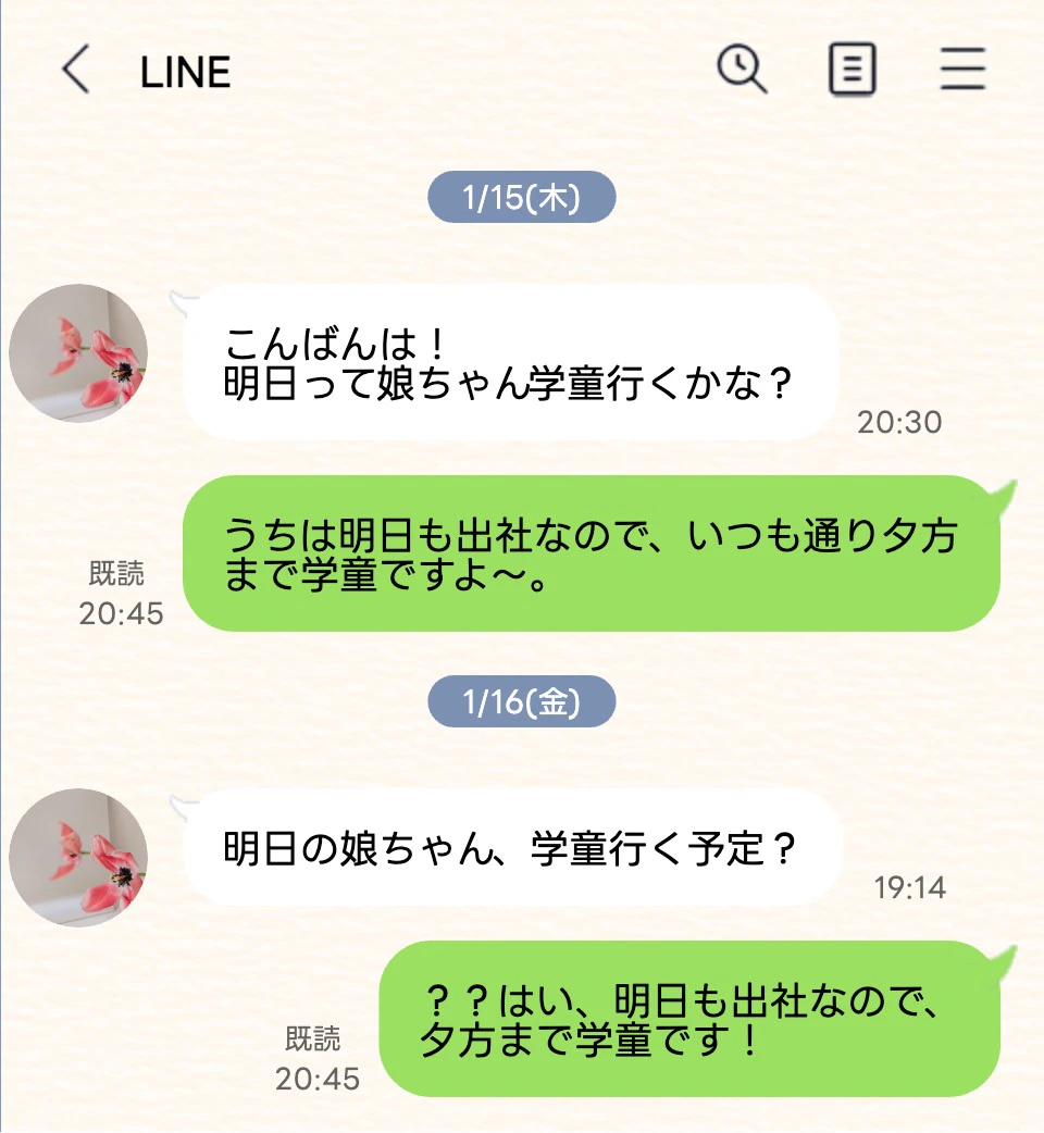なのに、そのママから毎回「明日学童行きますか?」とLINEが来ます。「娘も行くみたいなので確認でした」と