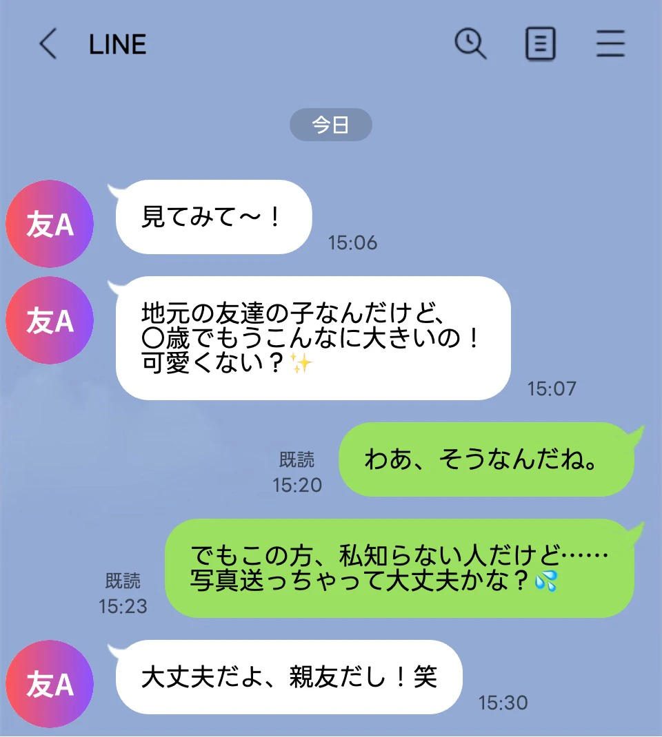 そのママ友は写真が好きで子供達が遊んでる時やイベント毎などよく写真を撮っているのですが、うちの子のも転送されてるのかな、とか不安になります…