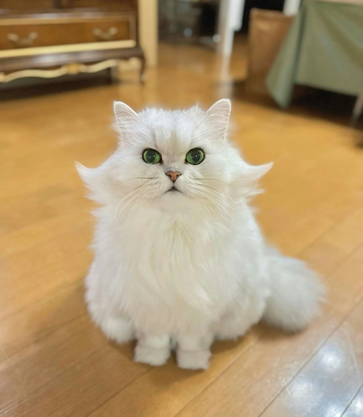 きちんとした姿勢でまっすぐこちらを見つめる姿は、中世ヨーロッパの貴族のよう。肖像画に描かれそうな佇まいです。左右ともバランスよく整えられた毛並みはとってもかわいいですね。この投稿には「美しい」「姿勢も整ってますね」「髭男爵のひぐちくんを思い出した」といったリプライがついていました。