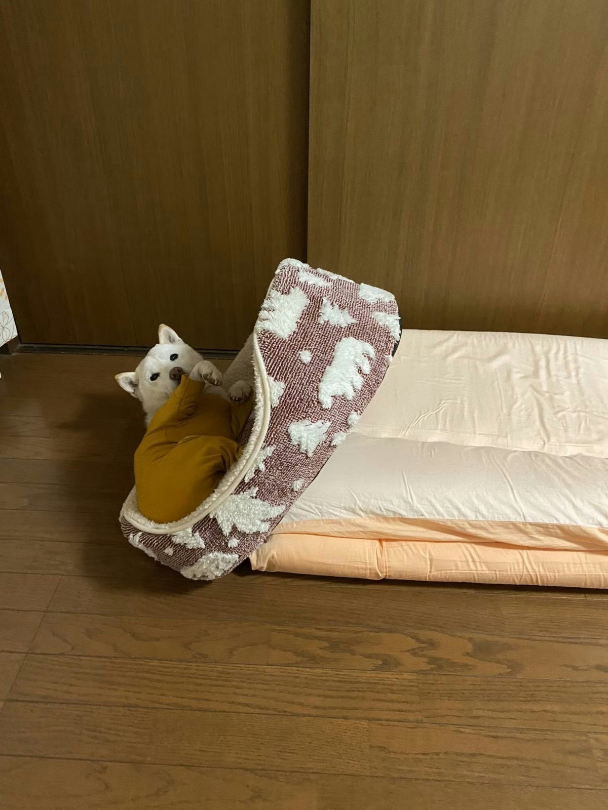 白柴まつさんは、ある日ドスンと音が聞こえたので、電気を付けたそう。そこにいたのは、ワンちゃん用ベッドに乗ったままの愛犬でした。落ちた状態のまま固まって助けを待つ表情は、とてもかわいいものでした。