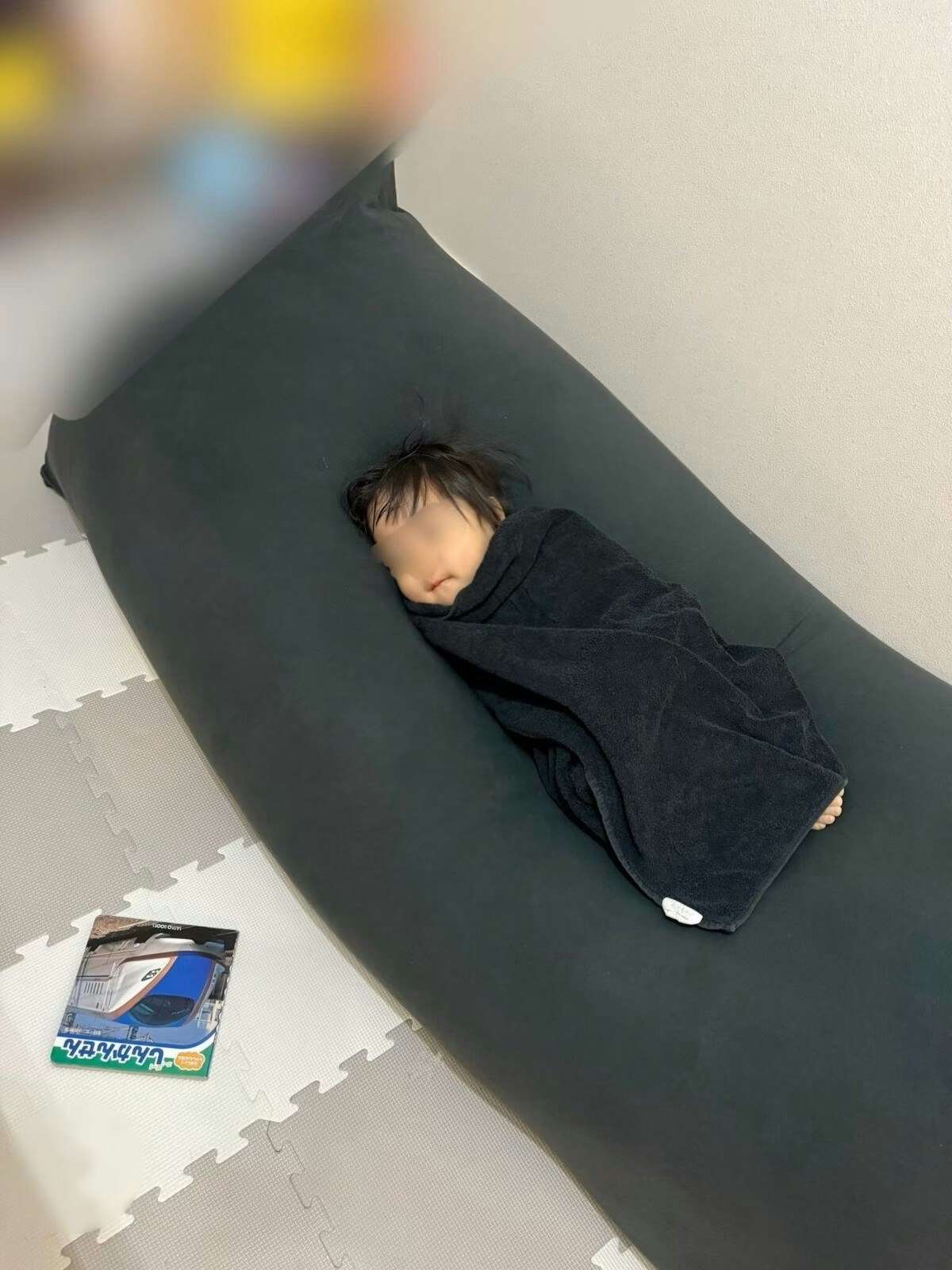 1週間保育園を頑張った息子くんが、ブランケットにくるまって大きなクッションに横になっている写真。ミノムシのような見た目が愛らしいですよね。