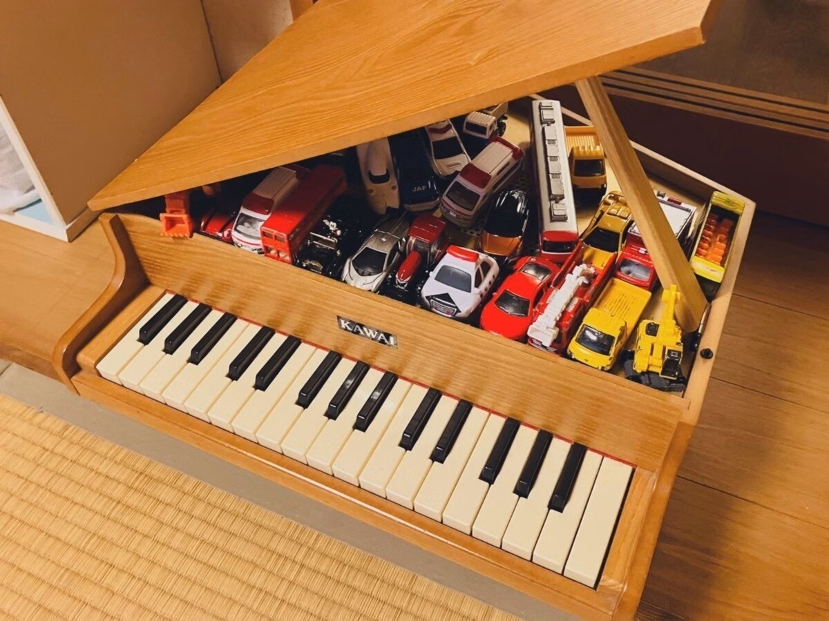 小さな木製ピアノの中にびっしりと入っているのは、カラフルなミニカー。赤ちゃんのころは楽器として楽しんだであろうピアノですが、5年がたった今では、立派な駐車場として活用されているよう。本来の使い方ではないものの、ピアノを生活の一部として、さまざまな形で楽しんでいるとも考えられそうです。