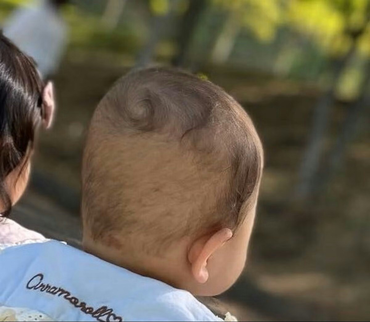ごまたゃ🐹🚛2y🚜(@chunupon)さんの投稿です。息子さんは赤ちゃんの時からつむじが「の」の字に巻いていたそう。