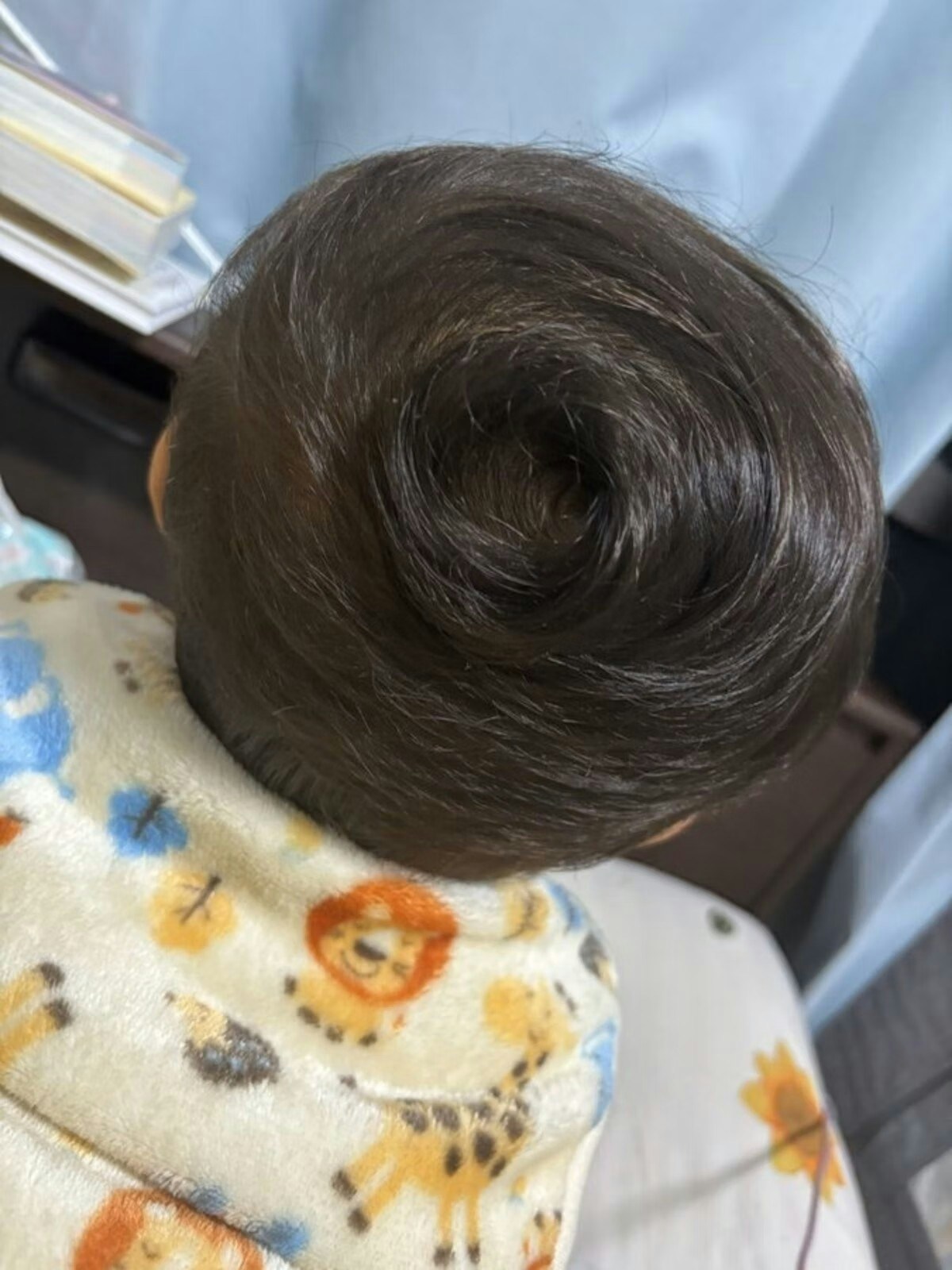 のの字つむじだった息子、髪の毛生えたら台風みたいな巻き方してる🌀 ※3