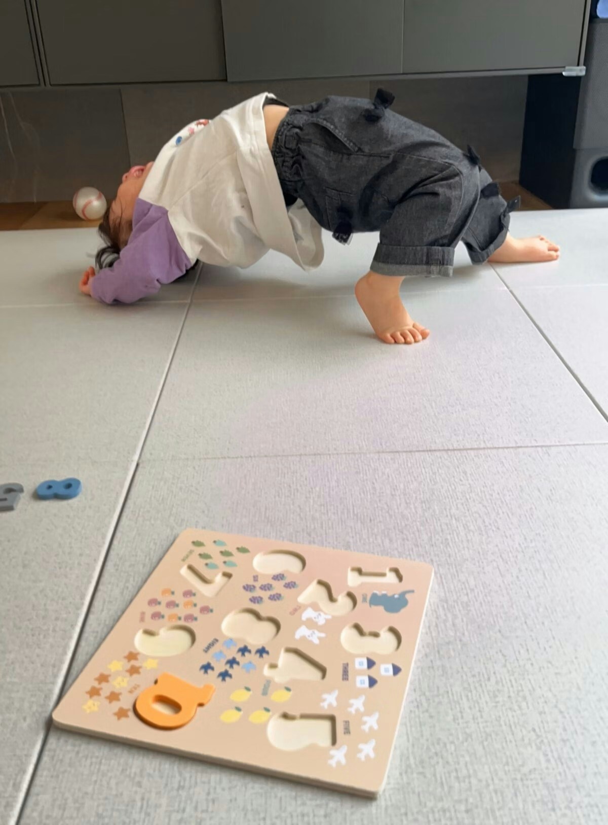 パズルがうまくできなくて怒ったのか、頭と足でブリッジをして「イヤ!」を全力アピールする娘さん。表情までは見えませんが、大きく開いた口から、表情も全力であることが想像できますね。寝っ転がるイヤイヤかと思いきや、まさかのブリッジ。見事なイヤイヤポーズです。
